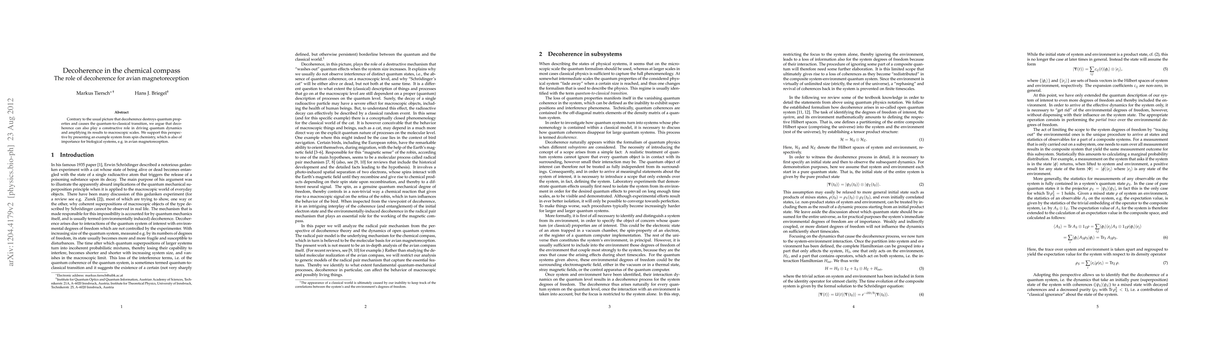 Summary: This paper argues that decoherence can constructively enhance quantum dynamics rather than merely causing quantum-to-classical transitions. It uses avian magnetoreception as a biological example to demonstrate this role of decoherence in amplifying quantum effects to macroscopic scales.