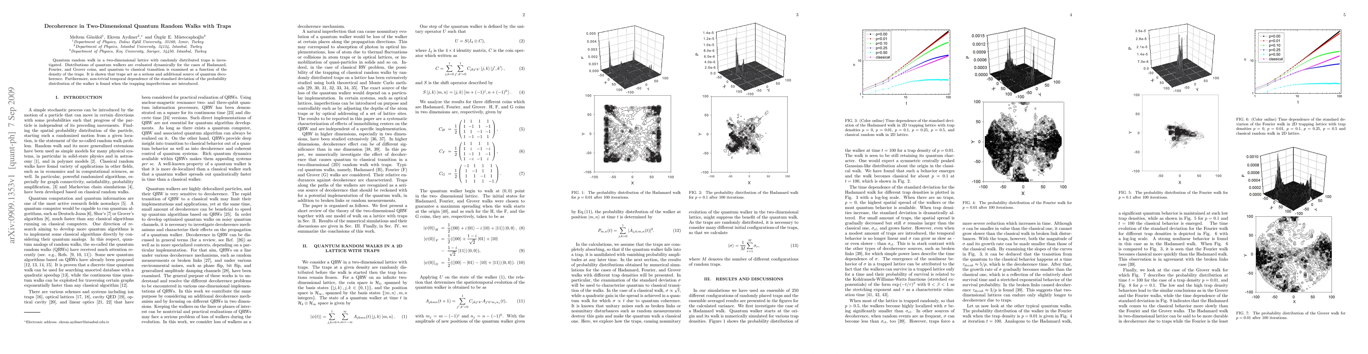 This paper investigates quantum random walks in a two-dimensional lattice with randomly placed traps, demonstrating that traps significantly contribute to decoherence. It finds a non-trivial temporal dependence in the walker's probability distribution due to trapping imperfections.