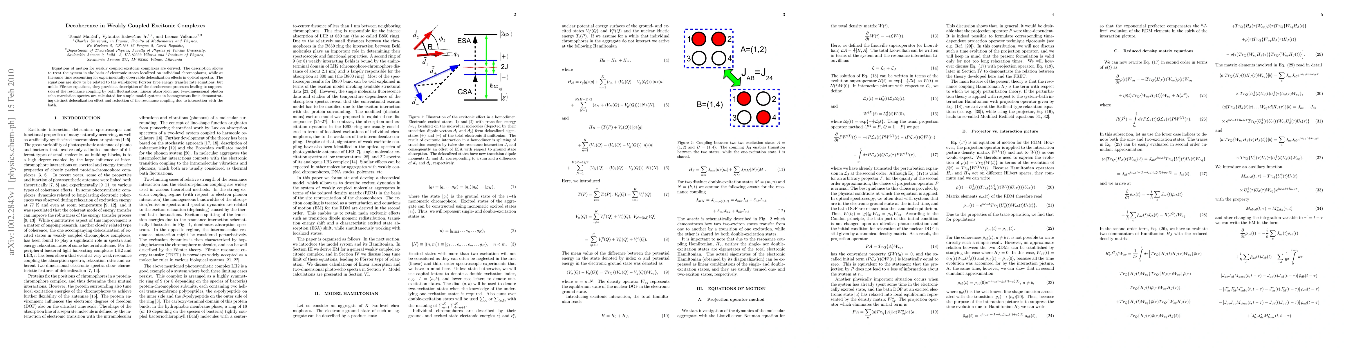 Equations of motion for weakly coupled excitonic complexes are derived. The description allows to treat the system in the basis of electronic states localized on individual chromophores, while at the same time accounting for experimentally observable delocalization effects in optical spectra. The equations are show to be related to the well-known Foerster type energy transfer rate equations, but unlike Foerster equations, they provide a description of the decoherence processes leading to suppression of the resonance coupling by bath fluctuations. Linear absorption and two-dimensional photon echo correlation spectra are calculated for simple model systems in homogeneous limit demonstrating distinct delocalization effect and reduction of the resonance coupling due to interaction with the bath.