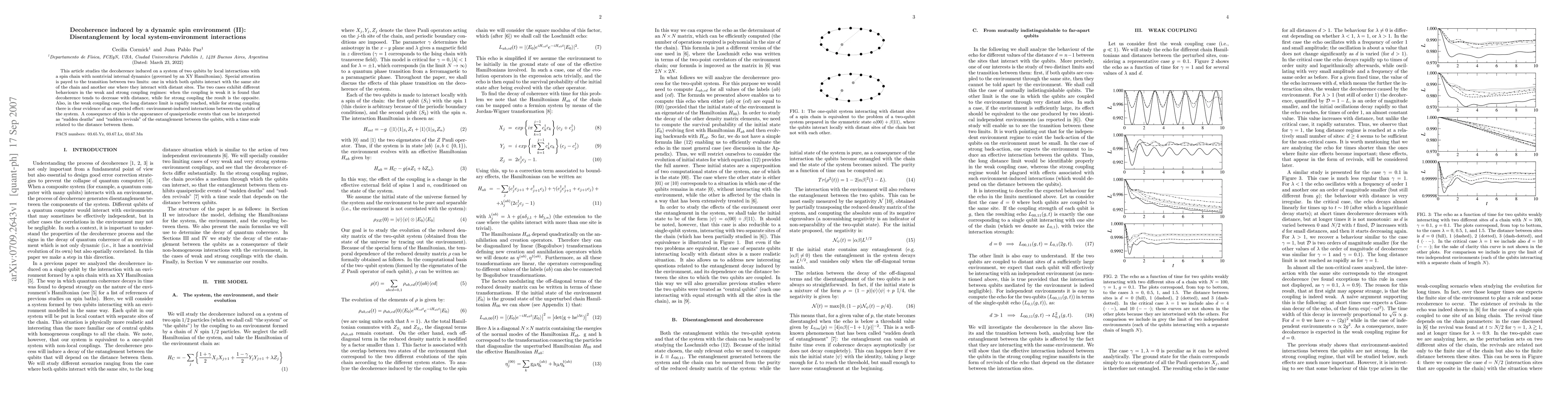 This article studies the decoherence induced on a system of two qubits by local interactions with a spin chain with nontrivial internal dynamics (governed by an XY Hamiltonian). Special attention is payed to the transition between two limits: one in which both qubits interact with the same site of the chain and another one where they interact with distant sites. The two cases exhibit different behaviours in the weak and strong coupling regimes: when the coupling is weak it is found that decoherence tends to decrease with distance, while for strong coupling the result is the opposite. Also, in the weak coupling case, the long distance limit is rapidly reached, while for strong coupling there is clear evidence of an expected effect: environment-induced interactions between the qubits of the system. A consequence of this is the appearance of quasiperiodic events that can be interpreted as ``sudden deaths'' and ``sudden revivals'' of the entanglement between the qubits, with a time scale related to the distance between them.