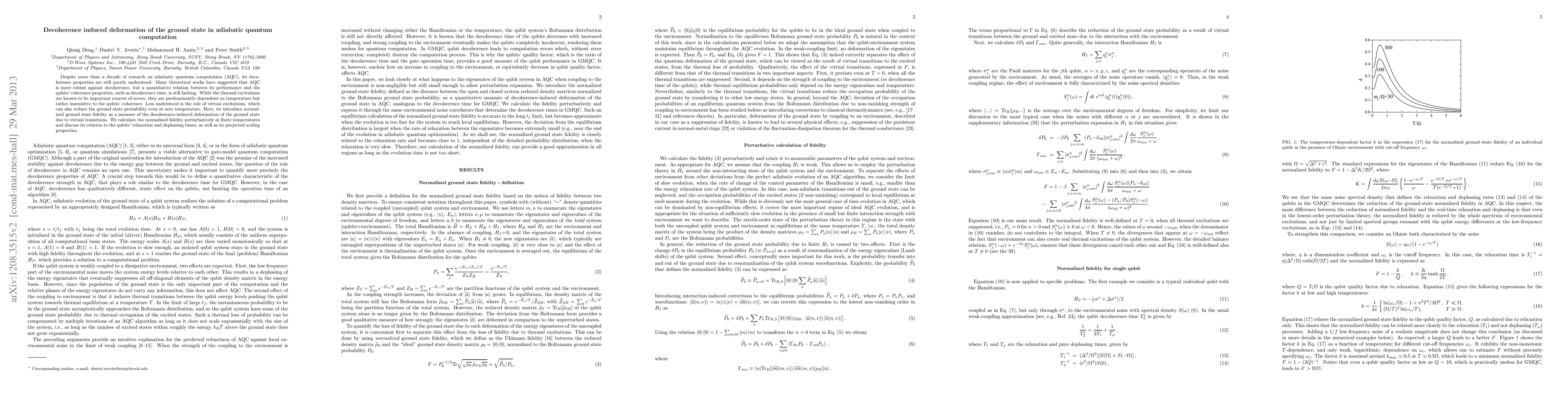This paper explores the impact of decoherence on adiabatic quantum computation (AQC) by introducing normalized ground state fidelity to quantify the deformation of the ground state due to virtual excitations. It investigates the relationship between this fidelity and the qubits' relaxation and dephasing times, aiming to better understand AQC's robustness against decoherence.