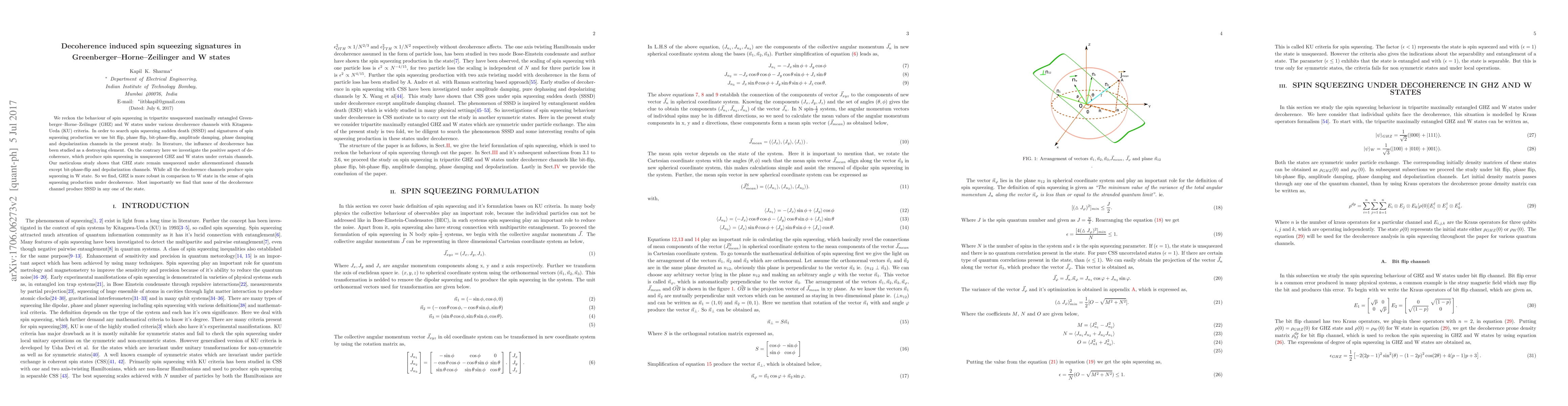 We reckon the behaviour of spin squeezing in tripartite unsqueezed maximally entangled Green- berger-Horne-Zeilinger (GHZ) and W states under various decoherence channels with Kitagawa- Ueda (KU) criteria. In order to search spin squeezing sudden death (SSSD) and signatures of spin squeezing production we use bit flip, phase flip, bit-phase-flip, amplitude damping, phase damping and depolarization channels in the present study. In literature, the influence of decoherence has been studied as a destroying element. On the contrary here we investigate the positive aspect of decoherence, which produce spin squeezing in unsqueezed GHZ and W states under certain channels. Our meticulous study shows that GHZ state remain unsqueezed under aforementioned channels except bit-phase-flip and depolarization channels. While all the decoherence channels produce spin squeezing in W state. So we find, GHZ is more robust in comparison to W state in the sense of spin squeezing production under decoherence. Most importantly we find that none of the decoherence channel produce SSSD in any one of the state.