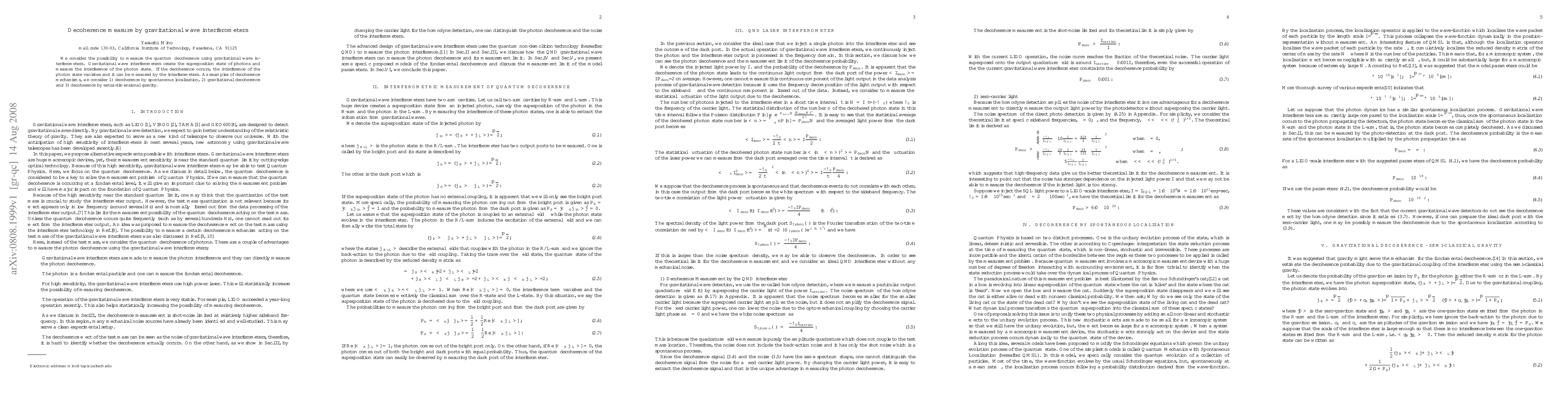 This paper explores the potential of gravitational wave interferometers to measure quantum decoherence through the interference of photon states, considering mechanisms like spontaneous localization, gravitational decoherence, and extra-dimensional gravity. The study suggests that interferometers could detect the loss of interference indicative of decoherence.
