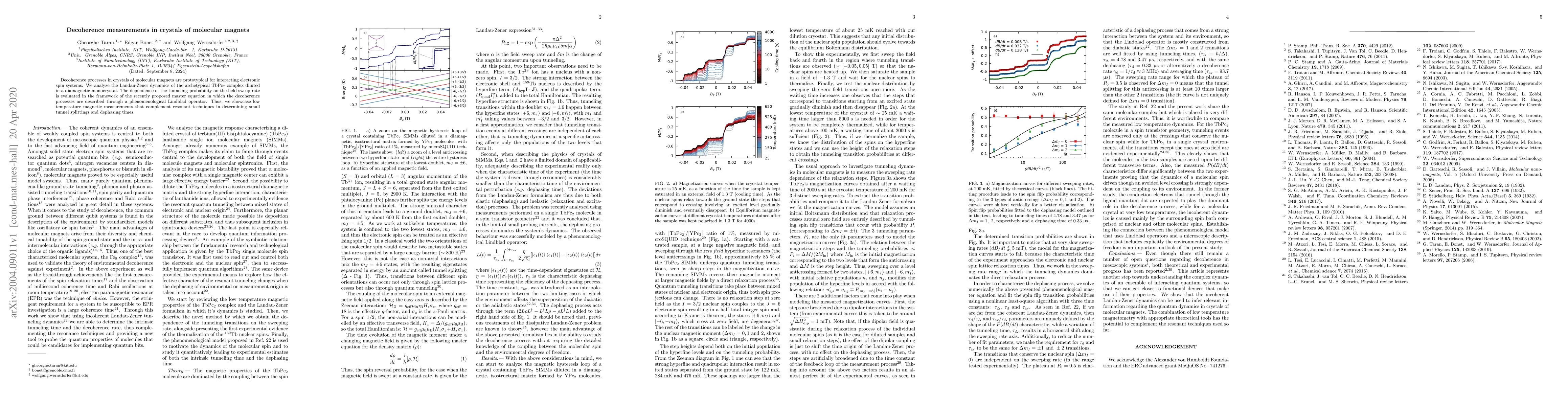 This paper investigates decoherence in molecular magnet crystals, focusing on the TbPc$_2$ complex. It employs Landau-Zener dynamics and a master equation framework to analyze the tunneling probability dependence on field sweep rates, providing insights into small tunnel splittings and dephasing times through low-temperature magnetic measurements.