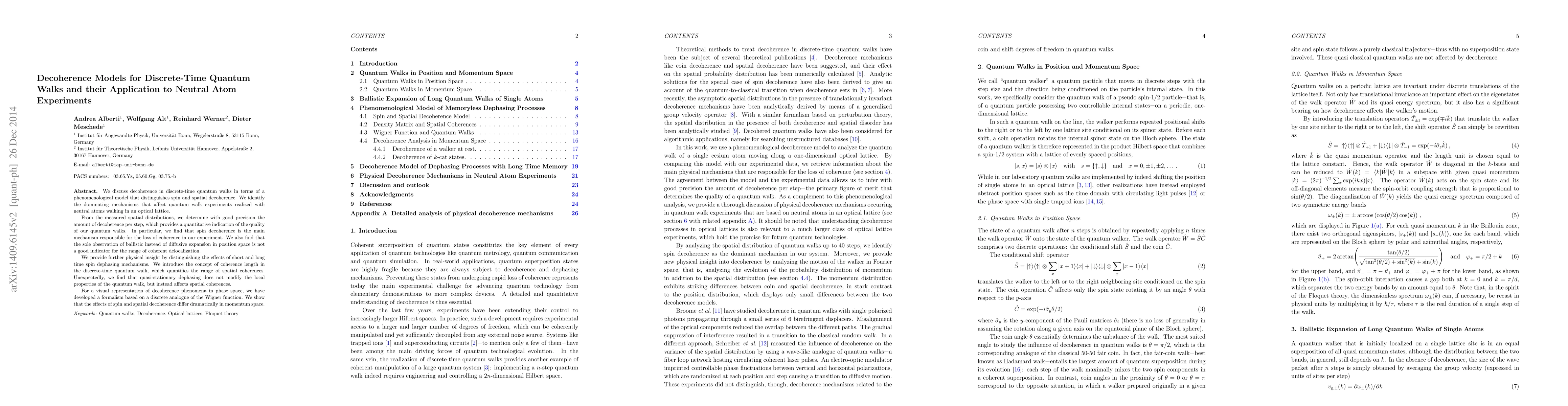 This paper develops a phenomenological model to study decoherence in discrete-time quantum walks, particularly focusing on neutral atom experiments in optical lattices. The authors find that spin decoherence, rather than spatial decoherence, primarily affects coherence loss, and introduce a coherence length to quantify spatial coherences, revealing that quasi-stationary dephasing impacts spatial coherences without altering local properties.