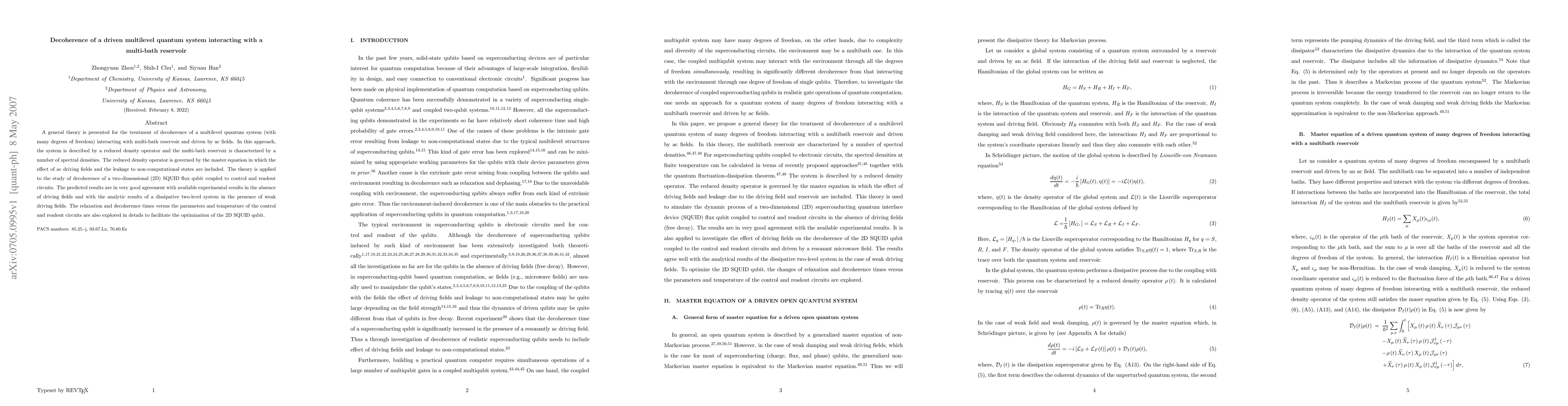 This paper develops a comprehensive theory for decoherence in a multilevel quantum system interacting with multiple thermal reservoirs and driven by ac fields, using a reduced density operator approach. The model is applied to a 2D SQUID flux qubit, showing good agreement with experimental data and aiding in the optimization of qubit parameters.