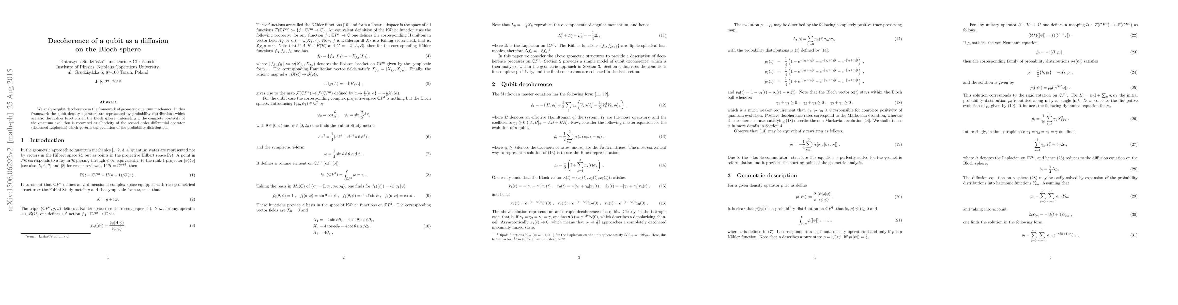 This work stands out by merging geometric quantum mechanics with the study of qubit decoherence, offering a fresh viewpoint that links quantum evolution to classical diffusion processes on the Bloch sphere, thereby bridging the gap between quantum and classical descriptions of decoherence.
