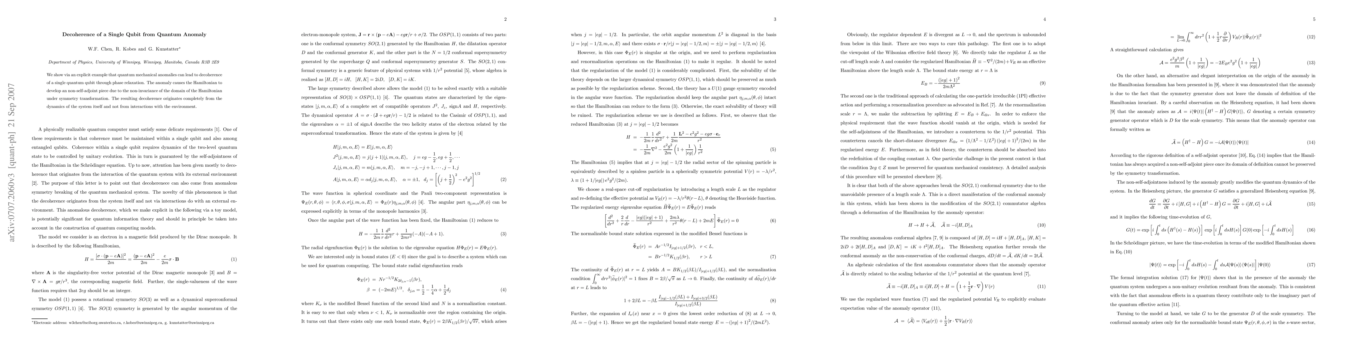 This paper demonstrates that quantum anomalies can induce decoherence in a single qubit through phase relaxation, with the anomaly causing a non-self-adjoint Hamiltonian component due to symmetry transformation non-invariance. The decoherence arises intrinsically from the system's dynamics rather than external environmental interactions.