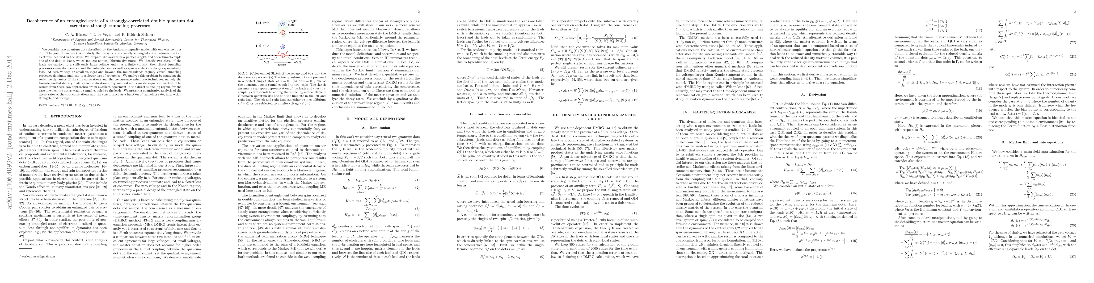 We consider two quantum dots described by the Anderson-impurity model with one electron per dot. The goal of our work is to study the decay of a maximally entangled state between the two electrons localized in the dots. We prepare the system in a perfect singlet and then tunnel-couple one of the dots to leads, which induces the non-equilibrium dynamics. We identify two cases: if the leads are subject to a sufficiently large voltage and thus a finite current, then direct tunneling processes cause decoherence and the entanglement as well as spin correlations decay exponentially fast. At zero voltage or small voltages and beyond the mixed-valence regime, virtual tunneling processes dominate and lead to a slower loss of coherence. We analyze this problem by studying the real-time dynamics of the spin correlations and the concurrence using two techniques, namely the time-dependent density matrix renormalization group method and a master-equation method. The results from these two approaches are in excellent agreement in the direct-tunneling regime for the case in which the dot is weakly tunnel-coupled to the leads. We present a quantitative analysis of the decay rates of the spin correlations and the concurrence as a function of tunneling rate, interaction strength, and voltage.