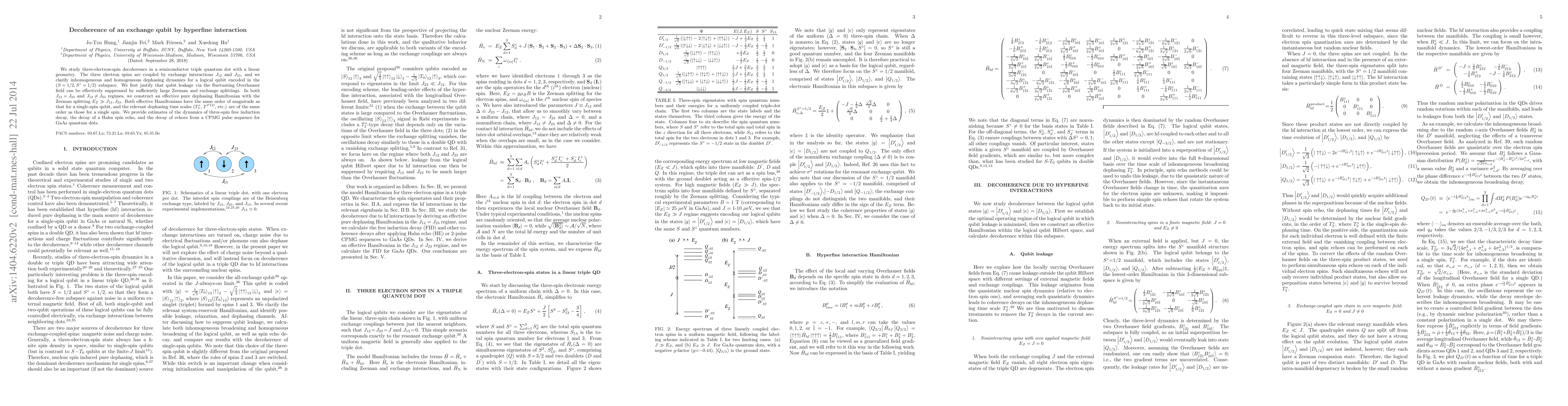 This paper investigates the decoherence mechanisms in a three-electron-spin quantum system in a semiconductor triple quantum dot, focusing on the dephasing dynamics of a logical qubit encoded in a specific subspace. The study finds that qubit leakage due to fluctuating Overhauser fields can be minimized with large Zeeman and exchange splittings, and provides estimates for various decoherence processes in GaAs quantum dots.