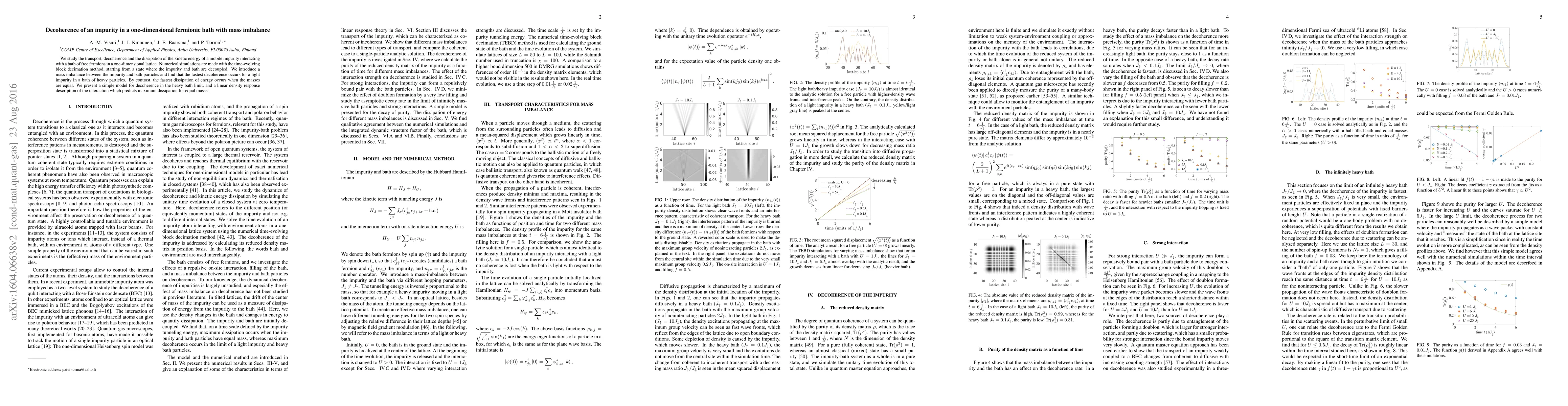 This study explores how an impurity's interaction with a one-dimensional fermionic bath affects its decoherence and energy dissipation. Using time-evolving block decimation simulations, researchers found faster decoherence with a light impurity in a heavy bath, and maximum energy dissipation when impurity and bath particle masses are equal. A simple model and linear density response description support these findings.