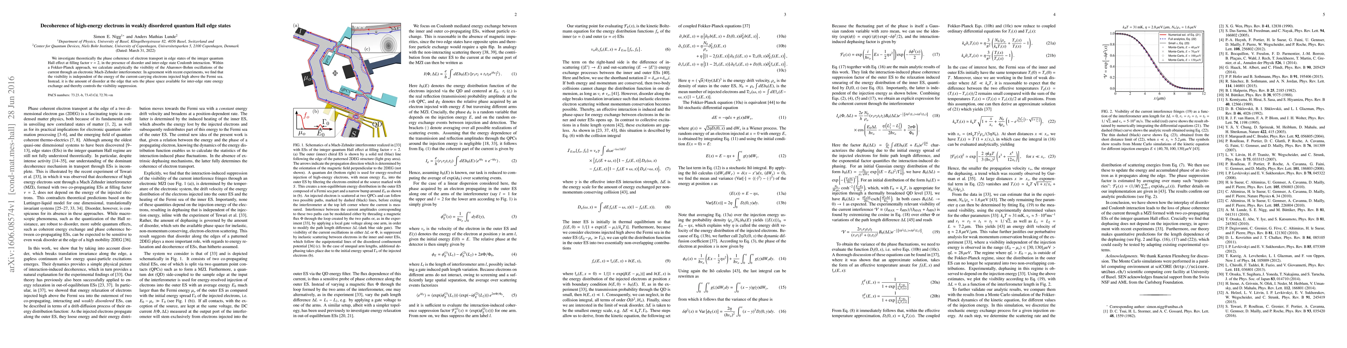 This paper theoretically examines the phase coherence of high-energy electrons in quantum Hall edge states under disorder and inter-edge Coulomb interaction, finding that the visibility of Aharonov-Bohm oscillations is independent of electron energy but depends on the level of edge disorder, which influences phase space for energy exchange.