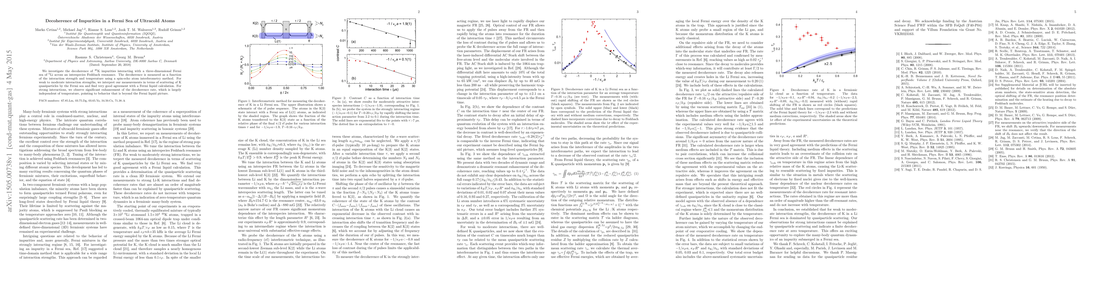 We investigate the decoherence of $^{40}$K impurities interacting with a three-dimensional Fermi sea of $^{6}$Li across an interspecies Feshbach resonance. The decoherence is measured as a function of the interaction strength and temperature using a spin-echo atom interferometry method. For weak to moderate interaction strengths, we interpret our measurements in terms of scattering of K quasiparticles by the Fermi sea and find very good agreement with a Fermi liquid calculation. For strong interactions, we observe significant enhancement of the decoherence rate, which is largely independent of temperature, pointing to behavior that is beyond the Fermi liquid picture.