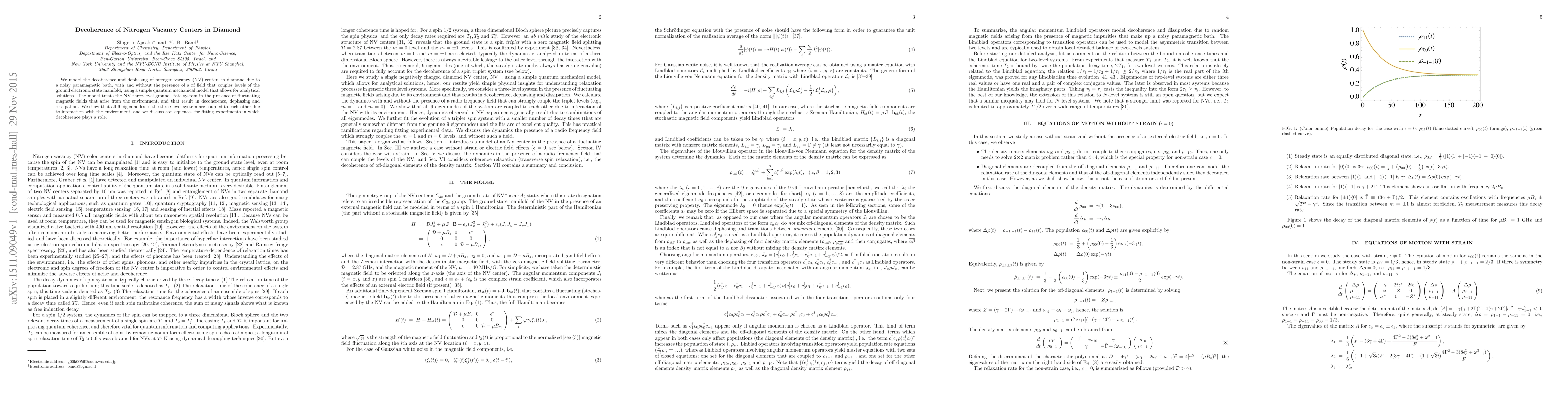 This paper models the decoherence and dephasing of nitrogen vacancy centers in diamond due to environmental noise, demonstrating that all eigenmodes of the three-level system are interconnected due to fluctuating magnetic fields. The study also examines the impact of an rf field on the system and its implications for experimental fitting involving decoherence.