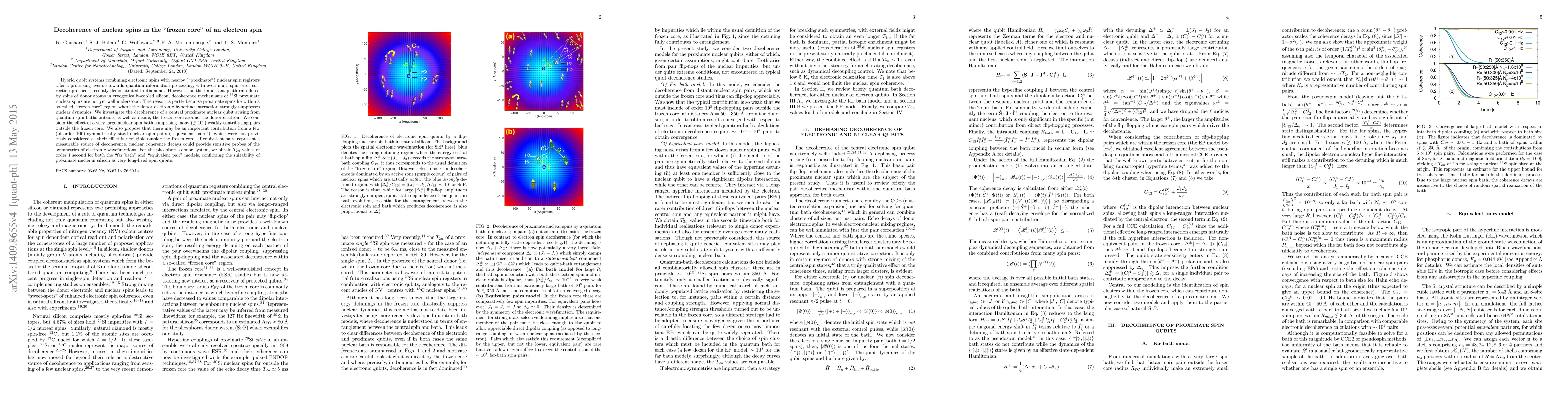 This paper investigates the decoherence mechanisms affecting proximate nuclear spins in silicon donor atoms, focusing on the "frozen core" region where electronic hyperfine interactions suppress nuclear dynamics. It proposes that both external quantum spin baths and internal "equivalent pairs" of nuclear spins contribute significantly to decoherence, with both models yielding long coherence times of around 1 second, indicating the potential for silicon-based nuclear spins as stable qubits.