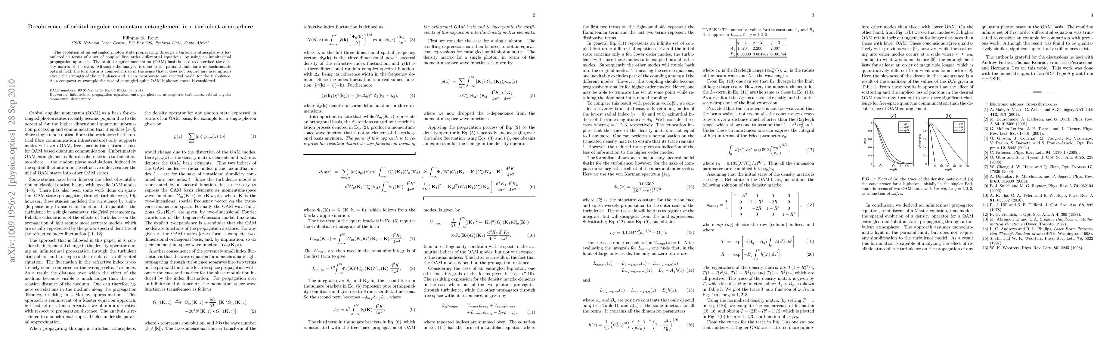 The evolution of an entangled photon state propagating through a turbulent atmosphere is formulated in terms of a set of coupled first order differential equations, by using an infinitesimal propagation approach. The orbital angular momentum (OAM) basis is used to described the density matrix of the state. Although the analysis is done in the paraxial limit for a monochromatic optical field, the formalism is comprehensive in the sense that it does not require any assumptions about the strength of the turbulence and it can incorporate any spectral model for the turbulence. As a comparative example the case of entangled qubit OAM biphoton states is considered.