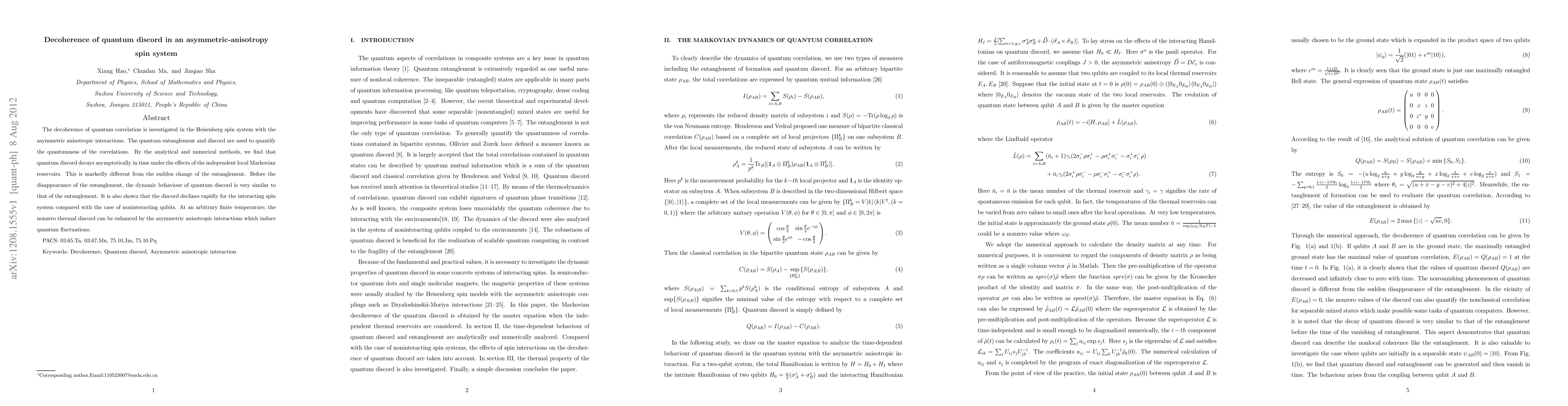 The decoherence of quantum correlation is investigated in the Heisenberg spin system with the asymmetric anisotropic interactions. The quantum entanglement and discord are used to quantify the quantumness of the correlations. By the analytical and numerical methods, we find that quantum discord decays asymptotically in time under the effects of the independent local Markovian reservoirs. This is markedly different from the sudden change of the entanglement. Before the disappearance of the entanglement, the dynamic behaviour of quantum discord is very similar to that of the entanglement. It is also shown that the discord declines rapidly for the interacting spin system compared with the case of noninteracting qubits. At an arbitrary finite temperature, the nonzero thermal discord can be enhanced by the asymmetric anisotropic interactions which induce quantum fluctuations.