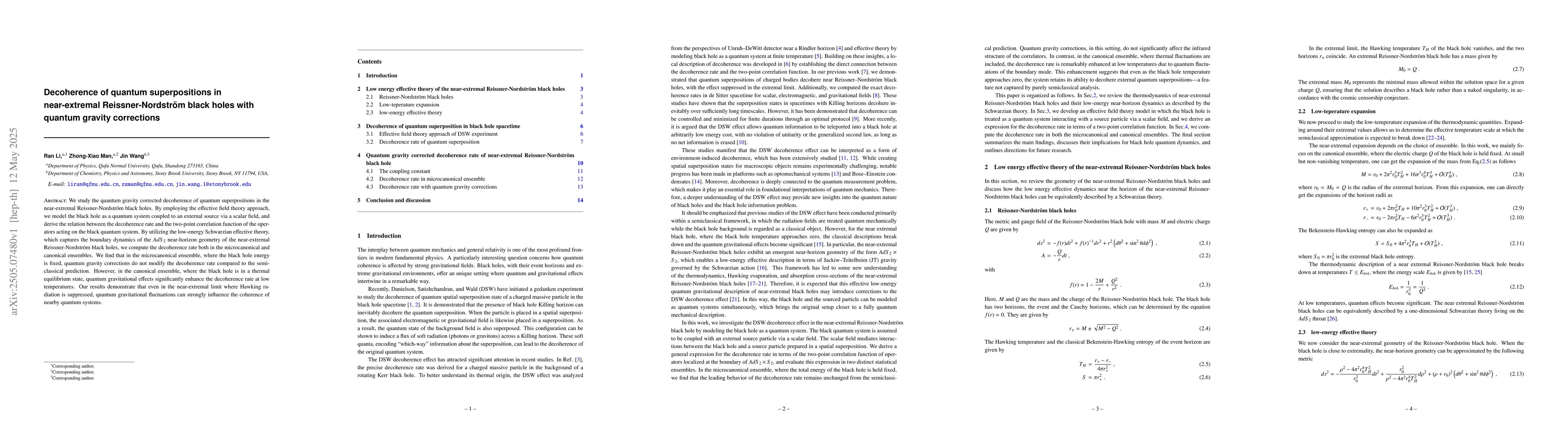 The paper presents a detailed analysis of decoherence in near-extremal Reissner-Nordström black holes, incorporating quantum gravity corrections using effective field theory and Schwarzian effective action.