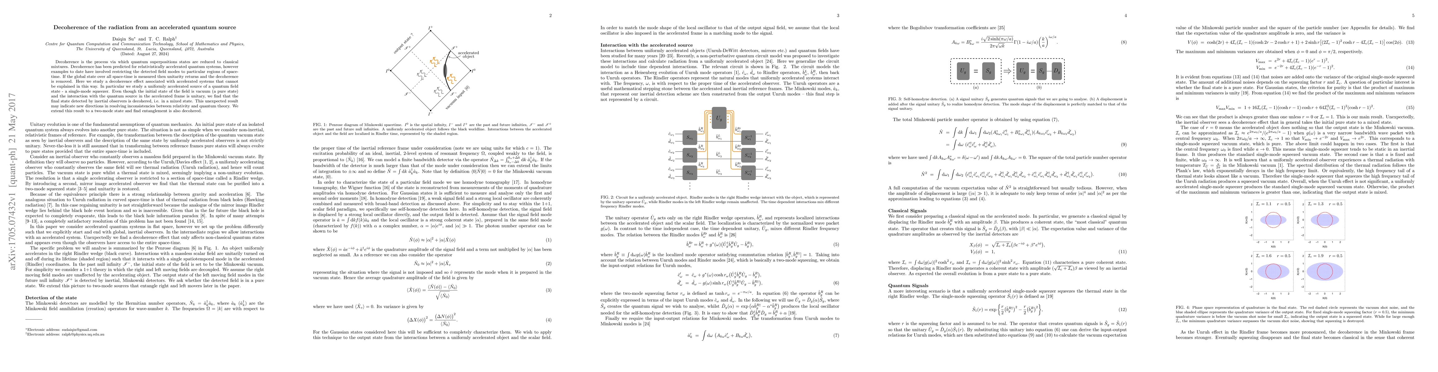 This paper investigates the decoherence of radiation from an accelerated quantum source, demonstrating that even a unitary interaction within an accelerated frame leads to decohered states detectable by inertial observers. This suggests novel insights into reconciling relativity and quantum mechanics.