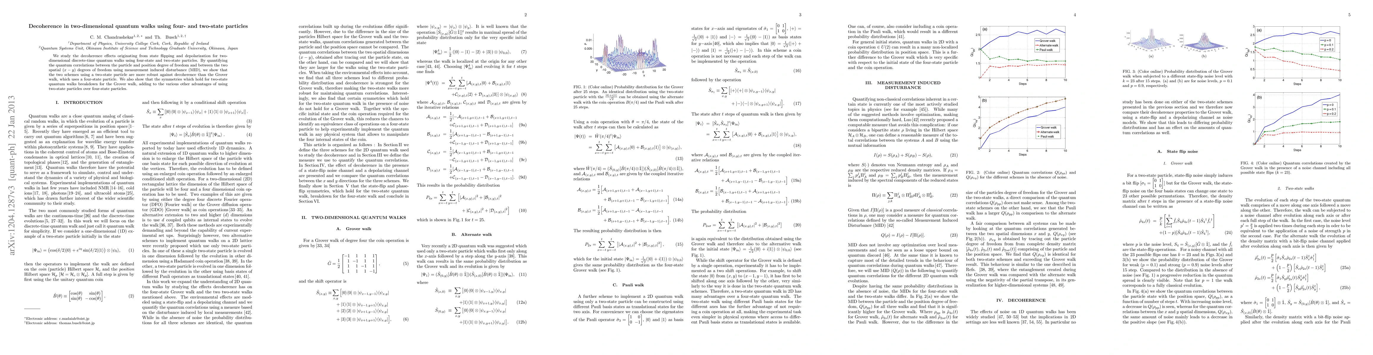 This paper investigates decoherence effects in two-dimensional quantum walks using four-state and two-state particles, finding that two-state particle schemes exhibit greater robustness against decoherence compared to the Grover walk using four-state particles, while also noting the breakdown of symmetries in the latter.