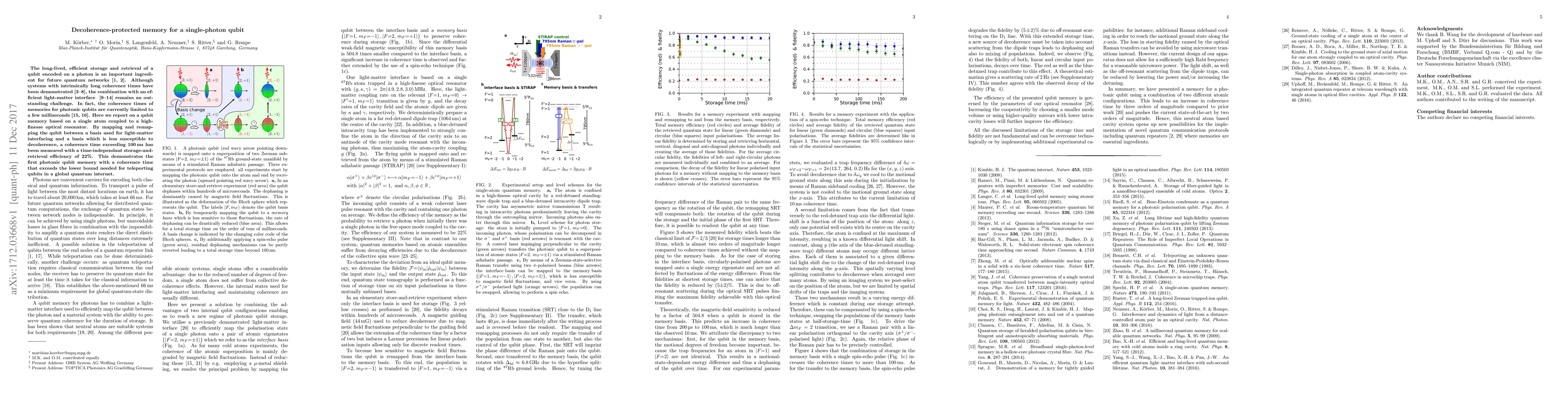 This paper presents a photonic qubit memory using a single atom in an optical resonator, achieving a coherence time of over 100 ms by switching between decoherence-protected and light-matter interfacing bases. The system demonstrates a storage-and-retrieval efficiency of 22%, surpassing the threshold for qubit teleportation in quantum networks.