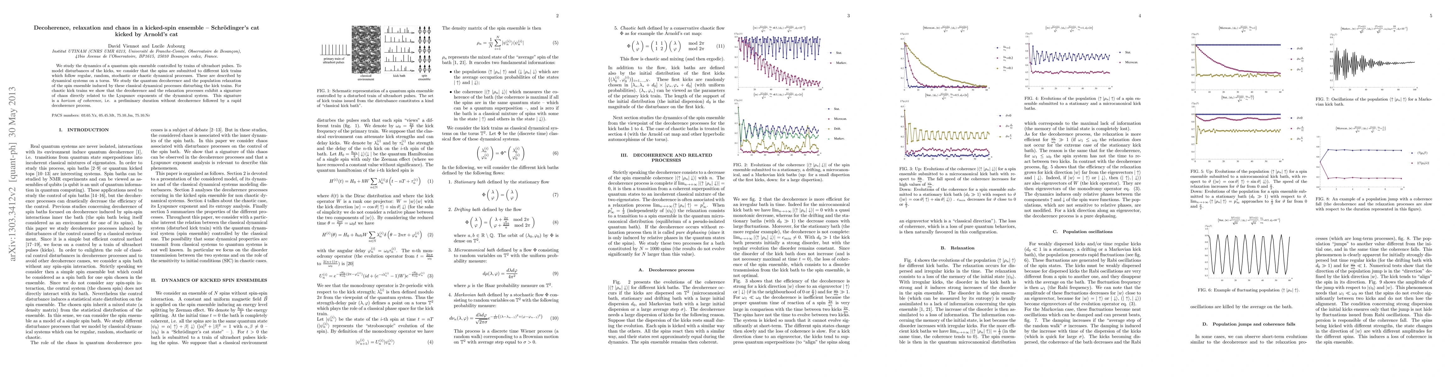 We study the dynamics of a quantum spin ensemble controlled by trains of ultrashort pulses. To model disturbances of the kicks, we consider that the spins are submitted to different kick trains which follow regular, random, stochastic or chaotic dynamical processes. These are described by dynamical systems on a torus. We study the quantum decoherence and the population relaxation of the spin ensemble induced by these classical dynamical processes disturbing the kick trains. For chaotic kick trains we show that the decoherence and the relaxation processes exhibit a signature of chaos directly related to the Lyapunov exponents of the dynamical system. This signature is a horizon of coherence, i.e. a preliminary duration without decoherence followed by a rapid decoherence process.