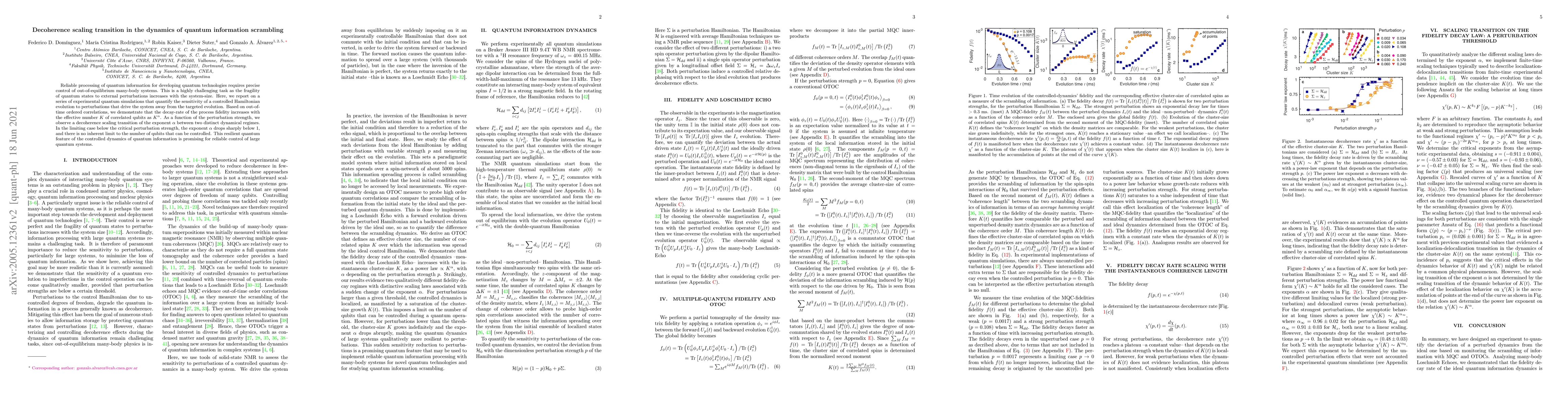 Reliable processing of quantum information for developing quantum technologies requires precise control of out-of-equilibrium many-bodysystems. This is a highly challenging task as the fragility of quantum states to external perturbations increases with the system-size. Here, we report on a series of experimental quantum simulations that quantify the sensitivity of a controlled Hamiltonian evolution to perturbations that drive the system away from the targeted evolution. Based on out-of-time ordered correlations, we demonstrate that the decay-rate of the process fidelity increases with the effective number $K$ of correlated qubits as $K^{\alpha}$. As a function of the perturbation strength, we observe a decoherence scaling transition of the exponent $\alpha$ between two distinct dynamical regimes. In the limiting case below the critical perturbation strength, the exponent $\alpha$ drops sharply below 1, and there is no inherent limit to the number of qubits that can be controlled. This resilient quantum feature of the controlled dynamics of quantum information is promising for reliable control of large quantum systems.
