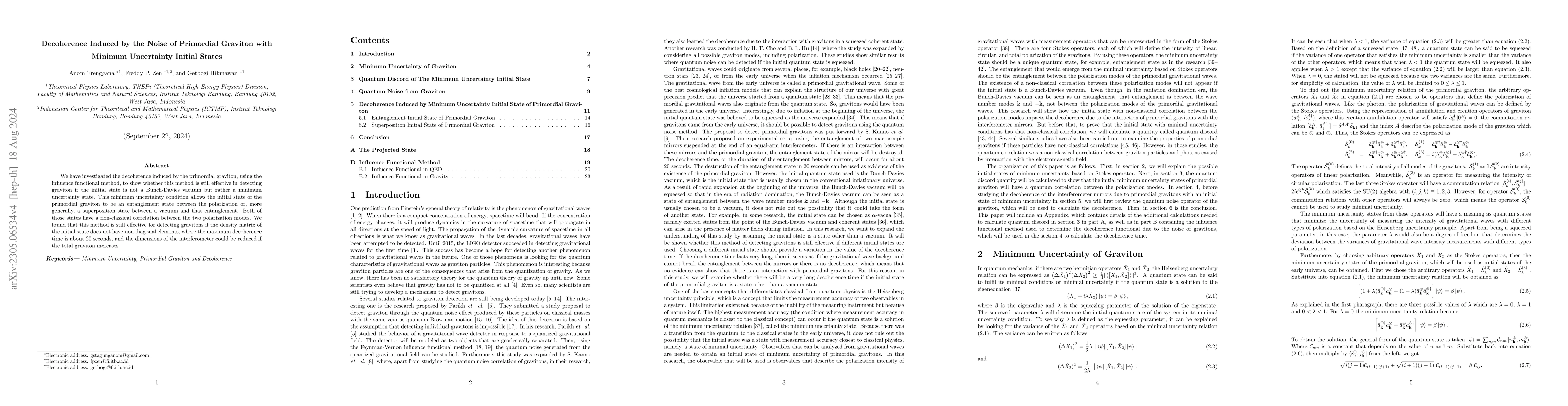 This paper investigates the decoherence time caused by primordial gravitons with minimum uncertainty initial states, finding that entanglement states lead to a decoherence time of up to 20 seconds. Quantum noise in superposition states can persist for approximately $10^{19}$ seconds.