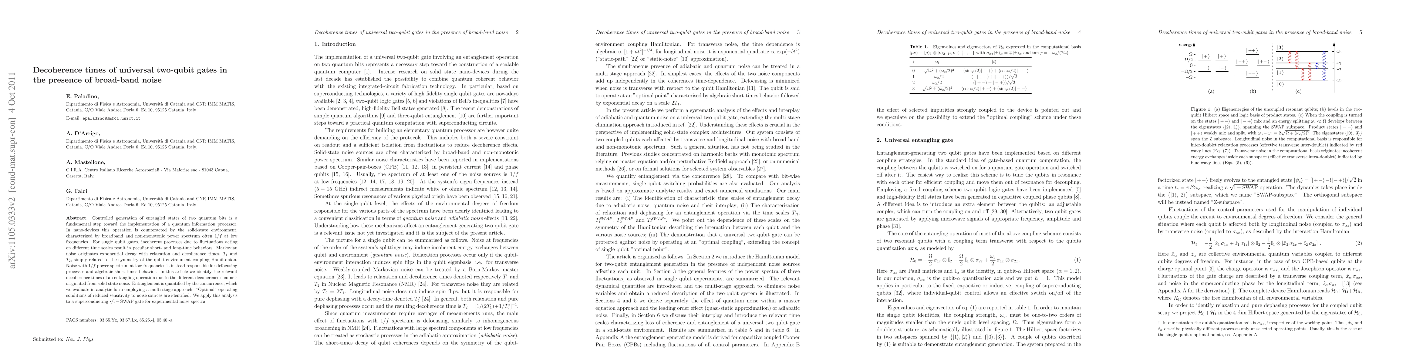 This paper investigates the decoherence times of universal two-qubit gates in nano-devices under broad-band noise, particularly the 1/f noise prevalent in solid-state environments. It identifies the optimal operating conditions minimizing sensitivity to noise, applying the analysis to a superconducting √i-SWAP gate.