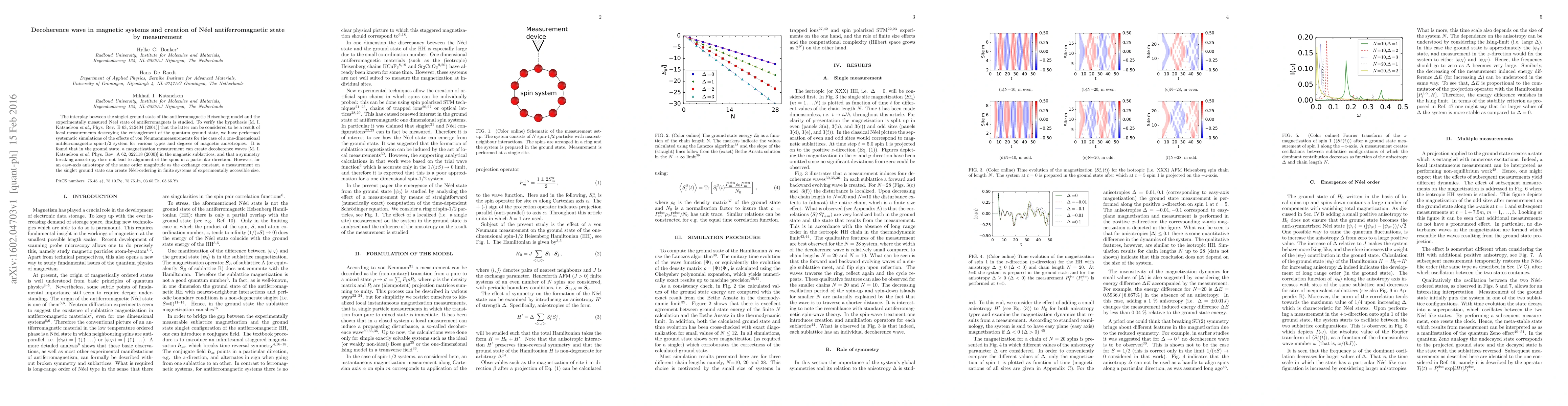 The interplay between the singlet ground state of the antiferromagnetic Heisenberg model and the experimentally measured N\'eel state of antiferromagnets is studied. To verify the hypothesis [M. I. Katsnelson et al., Phys. Rev. B 63, 212404 (2001)] that the latter can be considered to be a result of local measurements destroying the entanglement of the quantum ground state, we have performed systematic simulations of the effects of von Neumannmeasurements for the case of a one-dimensional antiferromagnetic spin-1/2 system for various types and degrees of magnetic anisotropies. It is found that in the ground state, a magnetization measurement can create decoherence waves [M. I. Katsnelson et al. Phys. Rev. A 62, 022118 (2000)] in the magnetic sublattices, and that a symmetry breaking anisotropy does not lead to alignment of the spins in a particular direction. However, for an easy-axis anisotropy of the same order magnitude as the exchange constant, a measurement on the singlet ground state can create N\'eel-ordering in finite systems of experimentally accessible size.