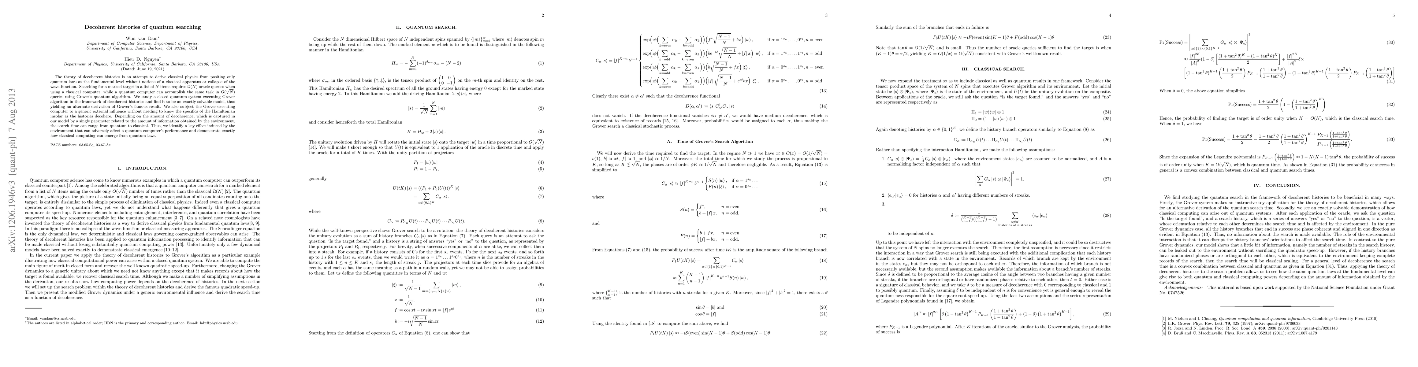 This paper explores the decoherent histories framework to derive classical physics from quantum laws, focusing on quantum searching. It finds that a quantum computer executing Grover's algorithm can be modeled as an exactly solvable system, showing how classical computing can emerge from quantum laws, with decoherence affecting search efficiency.