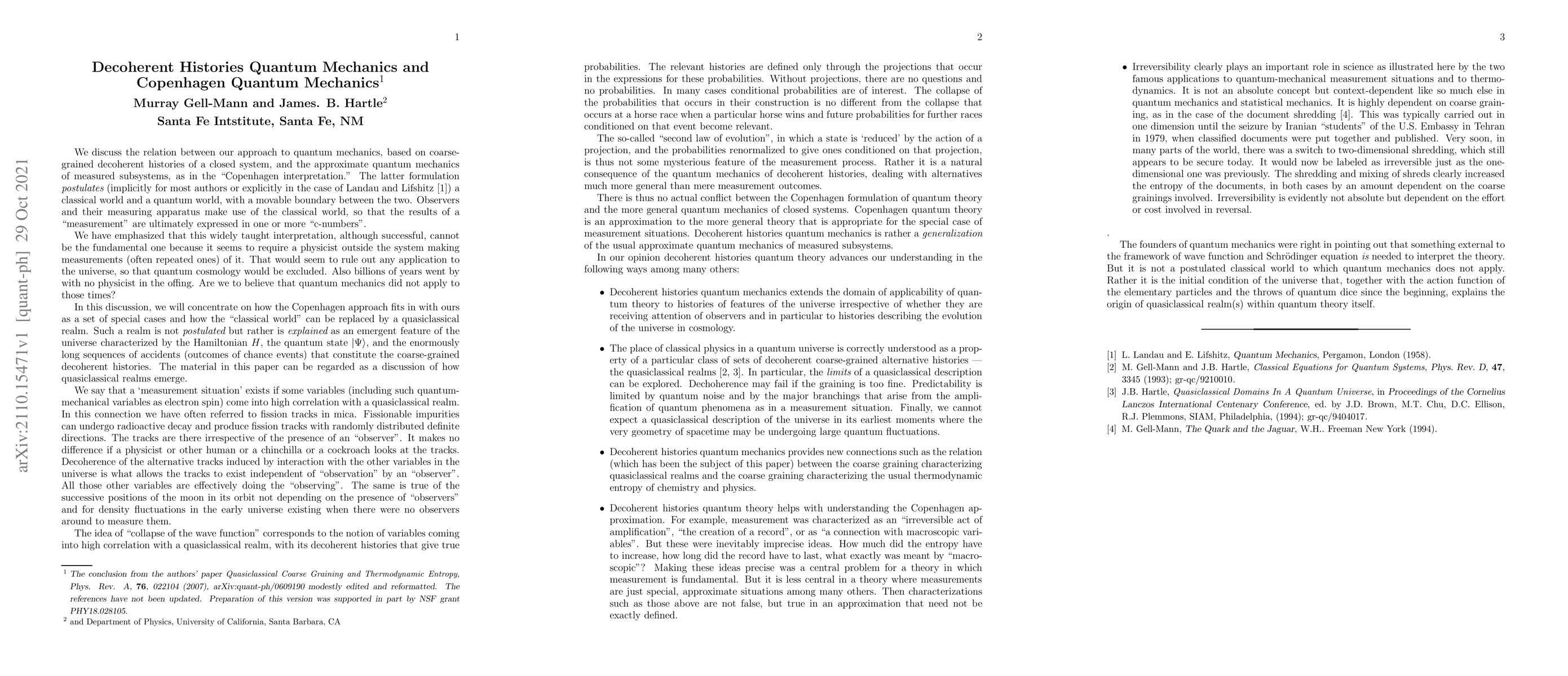 This paper explores the connection between decoherent histories quantum mechanics and the Copenhagen interpretation, demonstrating how classical behavior emerges naturally from sets of quasiclassical alternative histories rather than being postulated. It also addresses measurement, wave function collapse, and irreversibility within the framework of decoherent histories.