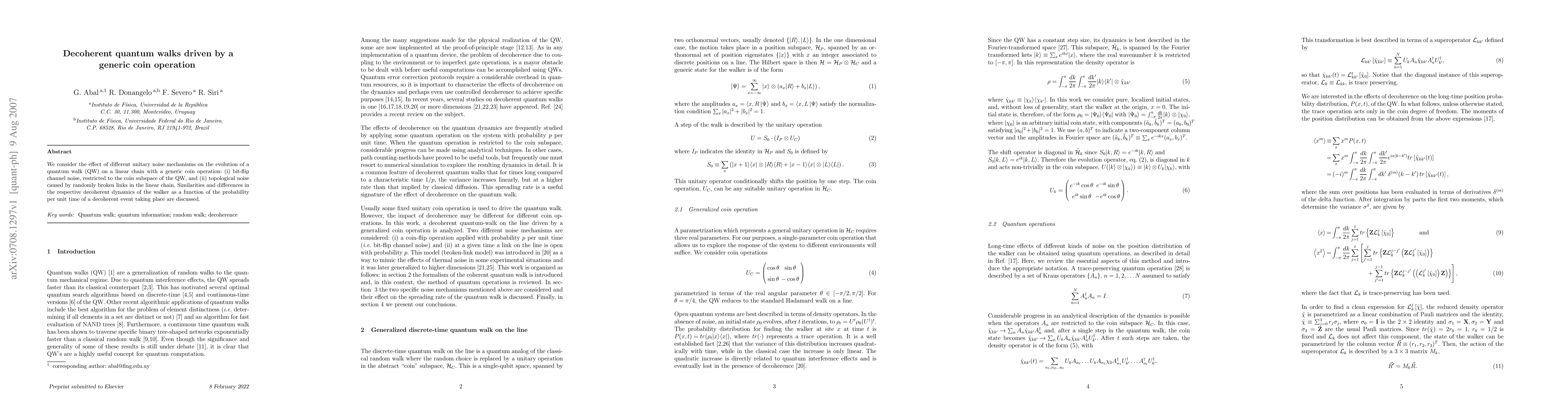 We consider the effect of different unitary noise mechanisms on the evolution of a quantum walk (QW) on a linear chain with a generic coin operation: (i) bit-flip channel noise, restricted to the coin subspace of the QW, and (ii) topological noise caused by randomly broken links in the linear chain. Similarities and differences in the respective decoherent dynamics of the walker as a function of the probability per unit time of a decoherent event taking place are discussed.