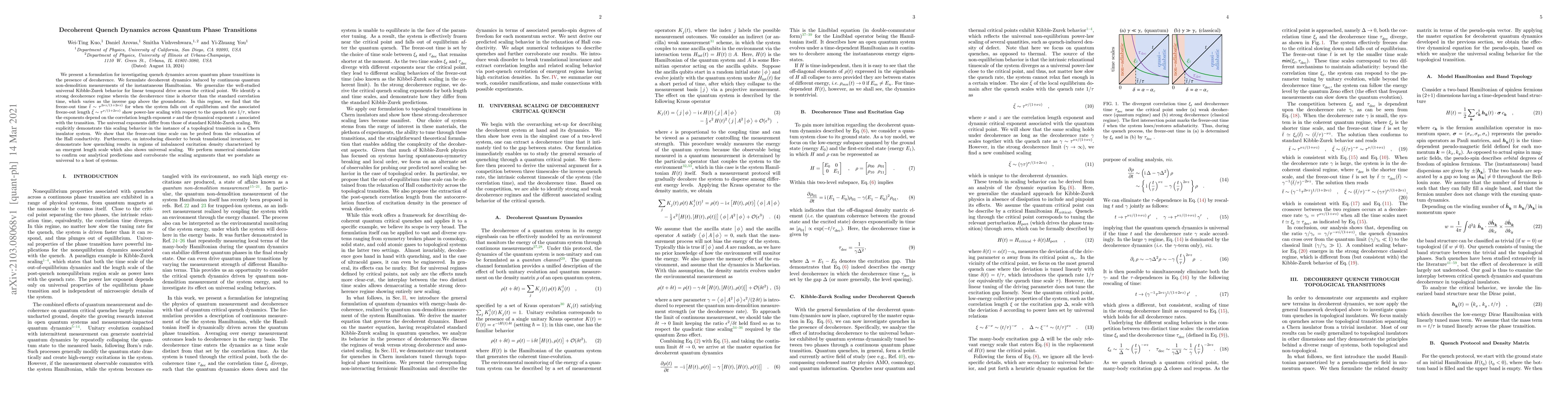 This paper formulates decoherent dynamics for quenches across quantum phase transitions, identifying a strong decoherence regime where the freeze-out time and length exhibit power-law scaling distinct from the standard Kibble-Zurek behavior. Numerical simulations confirm these findings in a topological transition in a Chern insulator system.