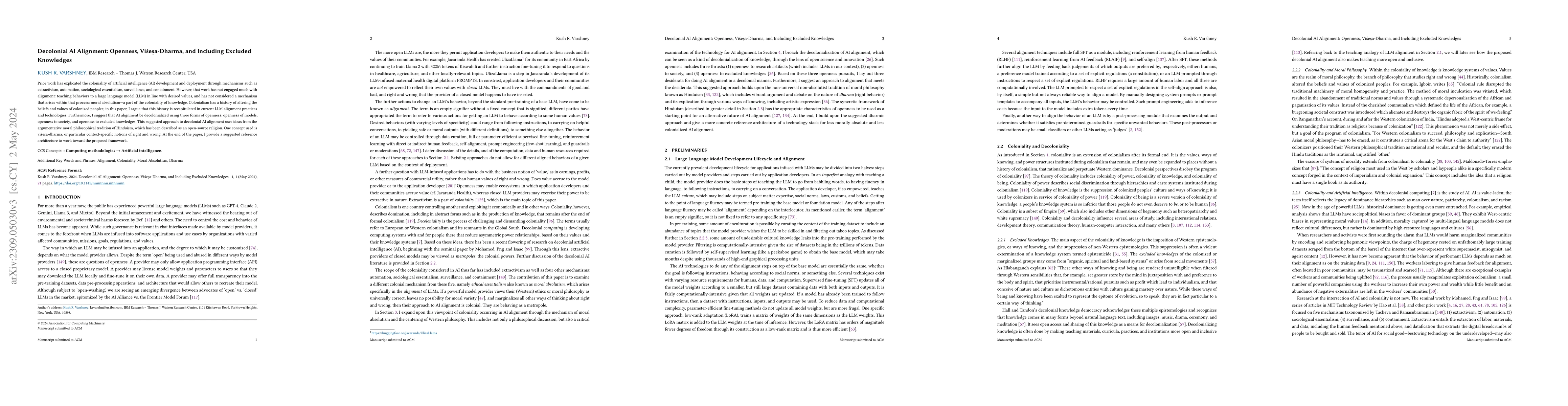 This paper critiques the coloniality in AI alignment practices, arguing that current methods replicate colonial moral absolutism by ignoring excluded knowledges. It proposes a decolonial approach through three forms of openness and incorporates ideas from Hinduism's moral philosophy, specifically viśeṣa-dharma, to foster more inclusive AI alignment.