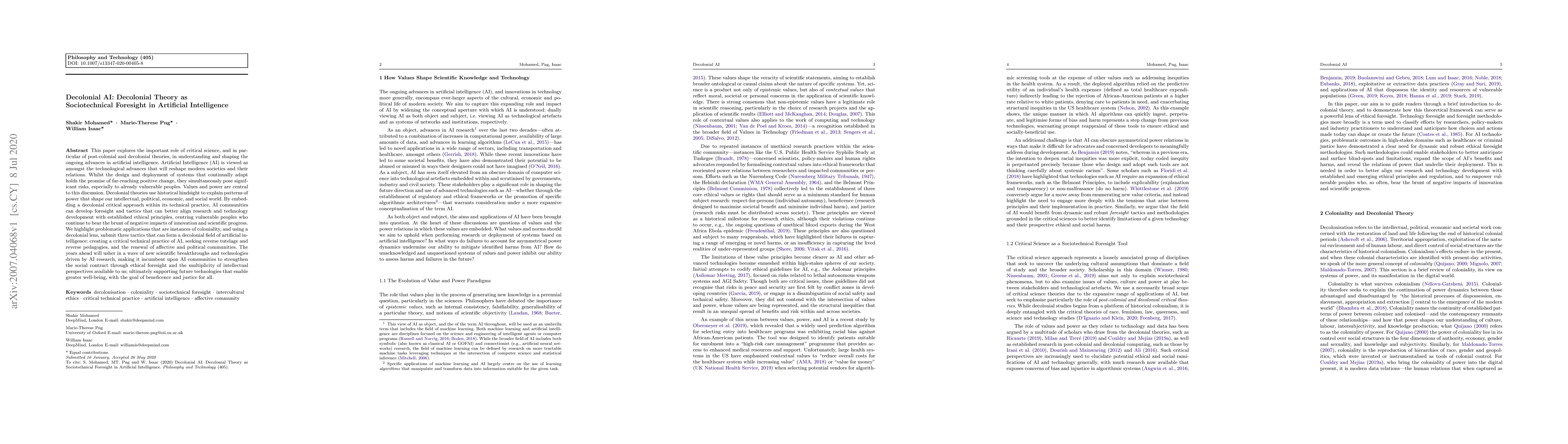 This paper explores the important role of critical science, and in particular of post-colonial and decolonial theories, in understanding and shaping the ongoing advances in artificial intelligence. Artificial Intelligence (AI) is viewed as amongst the technological advances that will reshape modern societies and their relations. Whilst the design and deployment of systems that continually adapt holds the promise of far-reaching positive change, they simultaneously pose significant risks, especially to already vulnerable peoples. Values and power are central to this discussion. Decolonial theories use historical hindsight to explain patterns of power that shape our intellectual, political, economic, and social world. By embedding a decolonial critical approach within its technical practice, AI communities can develop foresight and tactics that can better align research and technology development with established ethical principles, centring vulnerable peoples who continue to bear the brunt of negative impacts of innovation and scientific progress. We highlight problematic applications that are instances of coloniality, and using a decolonial lens, submit three tactics that can form a decolonial field of artificial intelligence: creating a critical technical practice of AI, seeking reverse tutelage and reverse pedagogies, and the renewal of affective and political communities. The years ahead will usher in a wave of new scientific breakthroughs and technologies driven by AI research, making it incumbent upon AI communities to strengthen the social contract through ethical foresight and the multiplicity of intellectual perspectives available to us; ultimately supporting future technologies that enable greater well-being, with the goal of beneficence and justice for all.