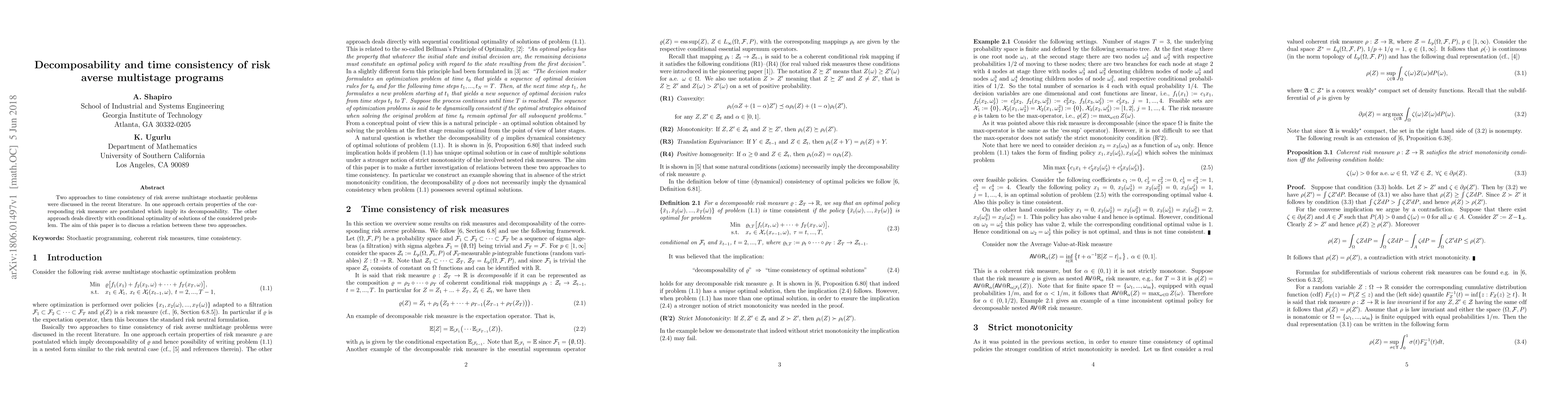 This paper explores the connection between two approaches to time consistency of risk-averse multistage stochastic problems, focusing on their implications for decomposability. It aims to provide a deeper understanding of the relationship between these approaches and their potential applications in decision-making.