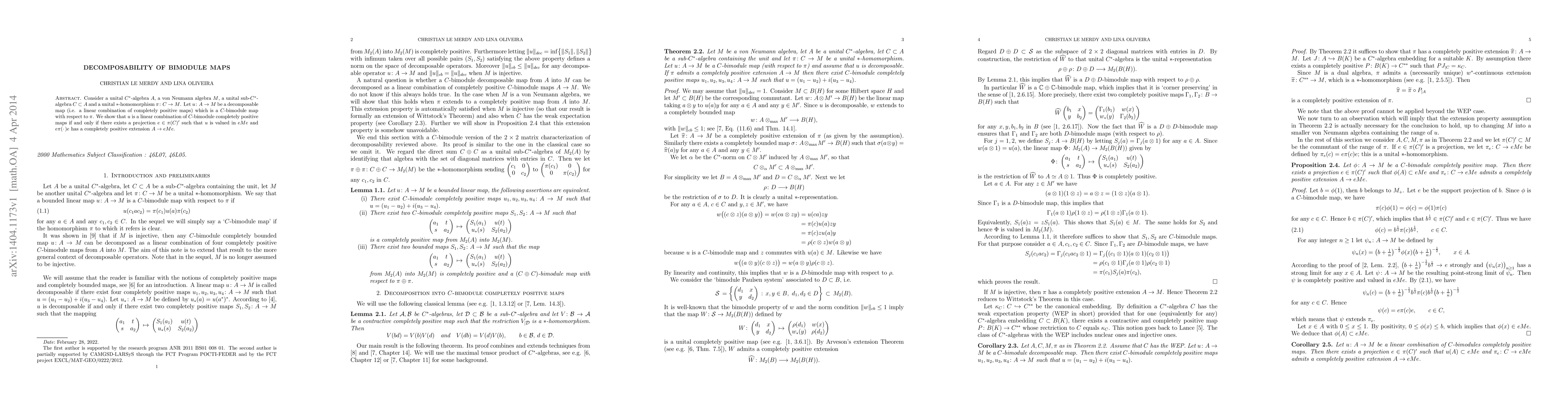 Consider a unital C*-algebra A, a von Neumann algebra M, a unital sub-C*-algebra C of A and a unital *-homomorphism $\pi$ from C to M. Let u: A --> M be a decomposable map (i.e. a linear combination of completely positive maps) which is a C-bimodule map with respect to $\pi$. We show that u is a linear combination of C-bimodule completely positive maps if and only if there exists a projection e in the commutant of $\pi(C)$ such that u is valued in eMe and $e\pi(.)e$ has a completely positive extension A --> eMe.