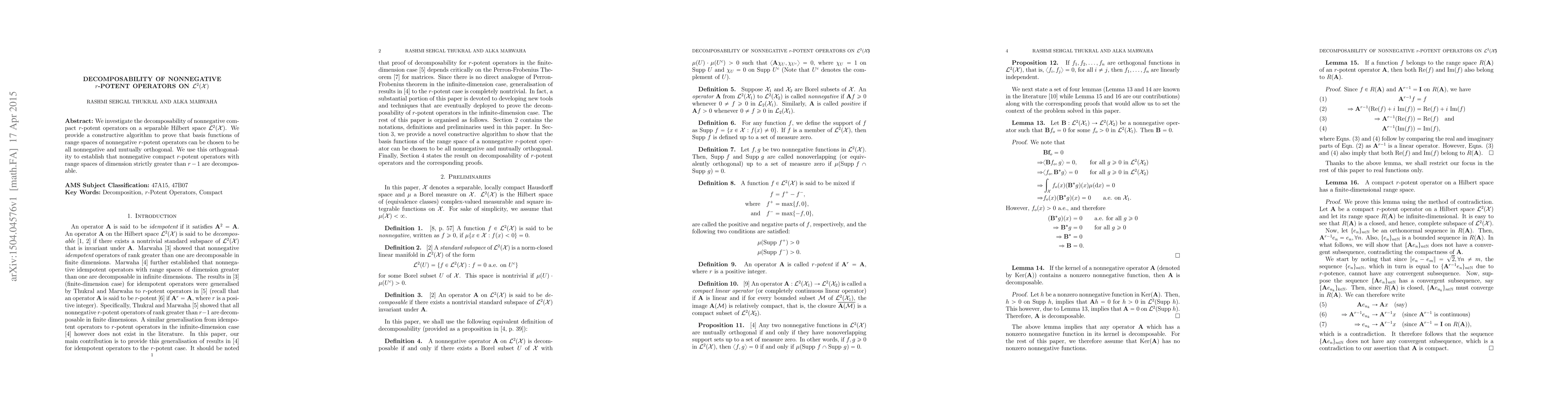 This paper explores the decomposability of nonnegative compact r-potent operators on L2(X), demonstrating a constructive algorithm to select nonnegative, mutually orthogonal basis functions for the range spaces. It concludes that such operators with range dimensions greater than r-1 are decomposable.