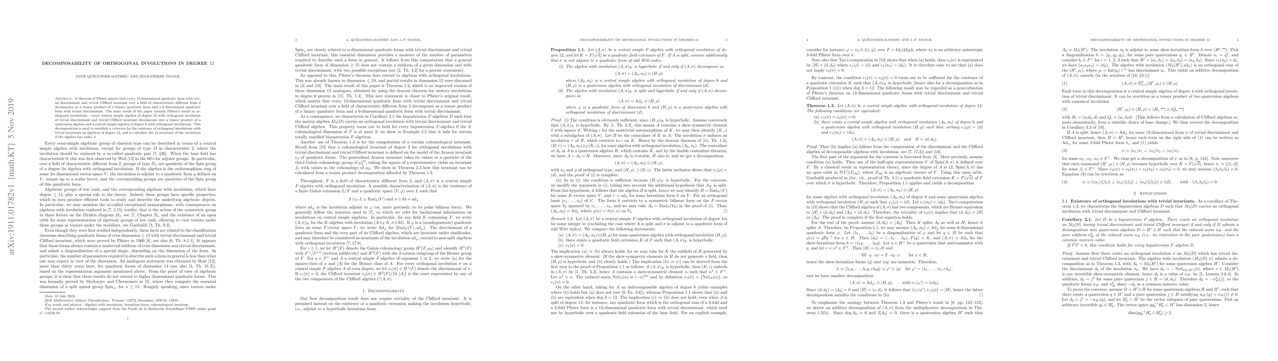 The paper proves that central simple algebras of degree 12 with orthogonal involutions of trivial discriminant and Clifford invariant decompose into tensor products involving quaternion algebras and degree 6 algebras, extending Pfister's theorem. It also provides criteria for such involutions' existence and computes the $f_3$-invariant for algebras of index 2.