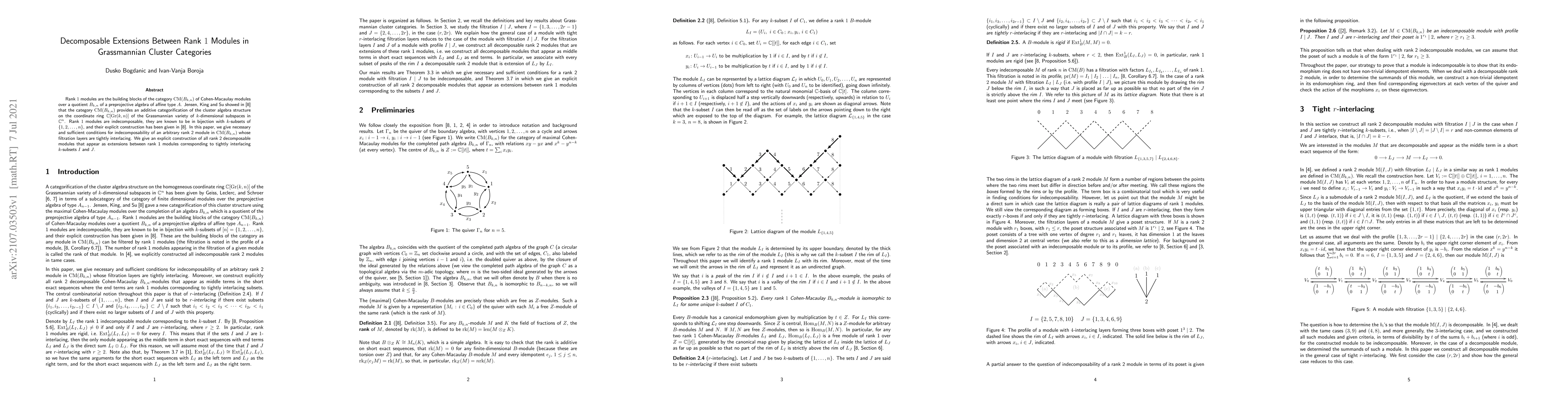 Rank $1$ modules are the building blocks of the category ${\rm CM}(B_{k,n}) $ of Cohen-Macaulay modules over a quotient $B_{k,n}$ of a preprojective algebra of affine type $A$. Jensen, King and Su showed in \cite{JKS16} that the category ${\rm CM}(B_{k,n})$ provides an additive categorification of the cluster algebra structure on the coordinate ring $\mathbb C[{\rm Gr}(k, n)]$ of the Grassmannian variety of $k$-dimensional subspaces in $\mathbb C^n$. Rank $1$ modules are indecomposable, they are known to be in bijection with $k$-subsets of $\{1,2,\dots,n\}$, and their explicit construction has been given in \cite{JKS16}. In this paper, we give necessary and sufficient conditions for indecomposability of an arbitrary rank 2 module in ${\rm CM}(B_{k,n})$ whose filtration layers are tightly interlacing. We give an explicit construction of all rank 2 decomposable modules that appear as extensions between rank 1 modules corresponding to tightly interlacing $k$-subsets $I$ and $J$.