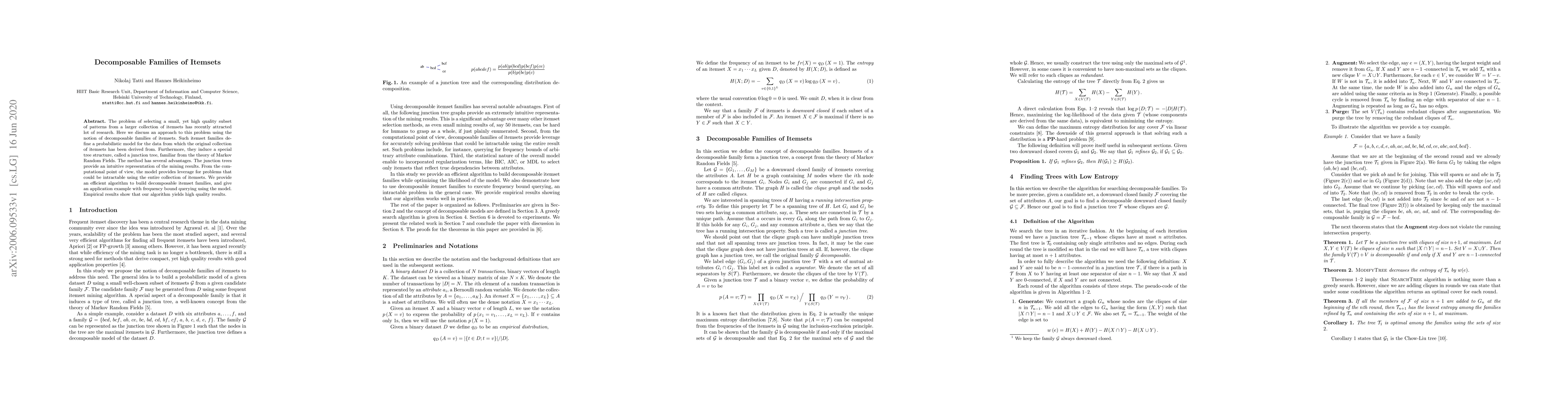 The problem of selecting a small, yet high quality subset of patterns from a larger collection of itemsets has recently attracted lot of research. Here we discuss an approach to this problem using the notion of decomposable families of itemsets. Such itemset families define a probabilistic model for the data from which the original collection of itemsets has been derived from. Furthermore, they induce a special tree structure, called a junction tree, familiar from the theory of Markov Random Fields. The method has several advantages. The junction trees provide an intuitive representation of the mining results. From the computational point of view, the model provides leverage for problems that could be intractable using the entire collection of itemsets. We provide an efficient algorithm to build decomposable itemset families, and give an application example with frequency bound querying using the model. Empirical results show that our algorithm yields high quality results.