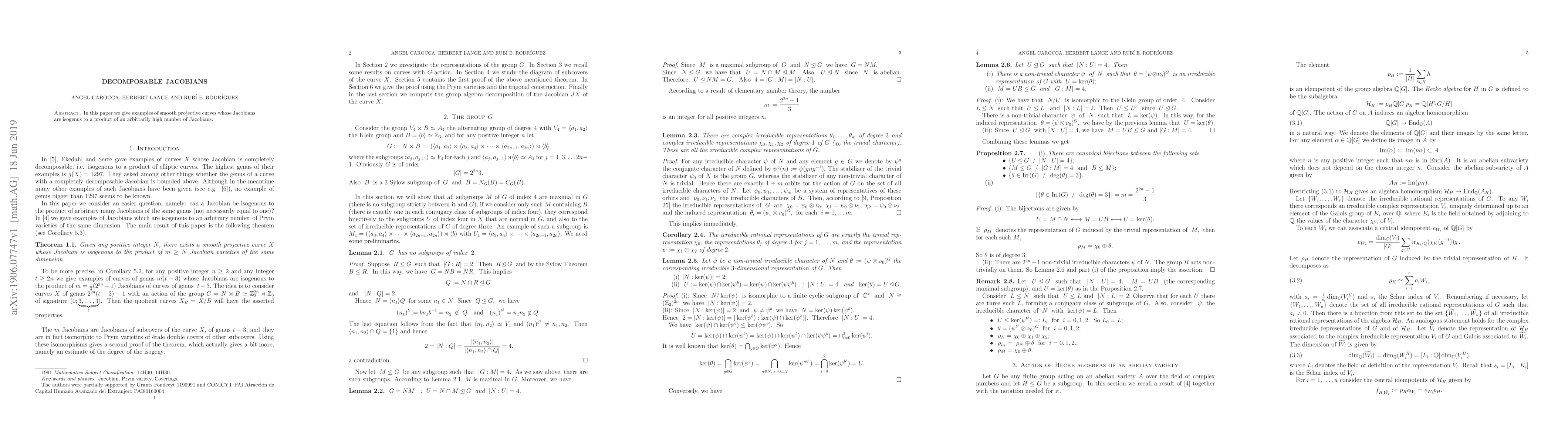 Summary: This paper presents examples of smooth projective curves where their Jacobians are isogenous to a product of multiple Jacobians, demonstrating the existence of decomposable Jacobians of increasing complexity.