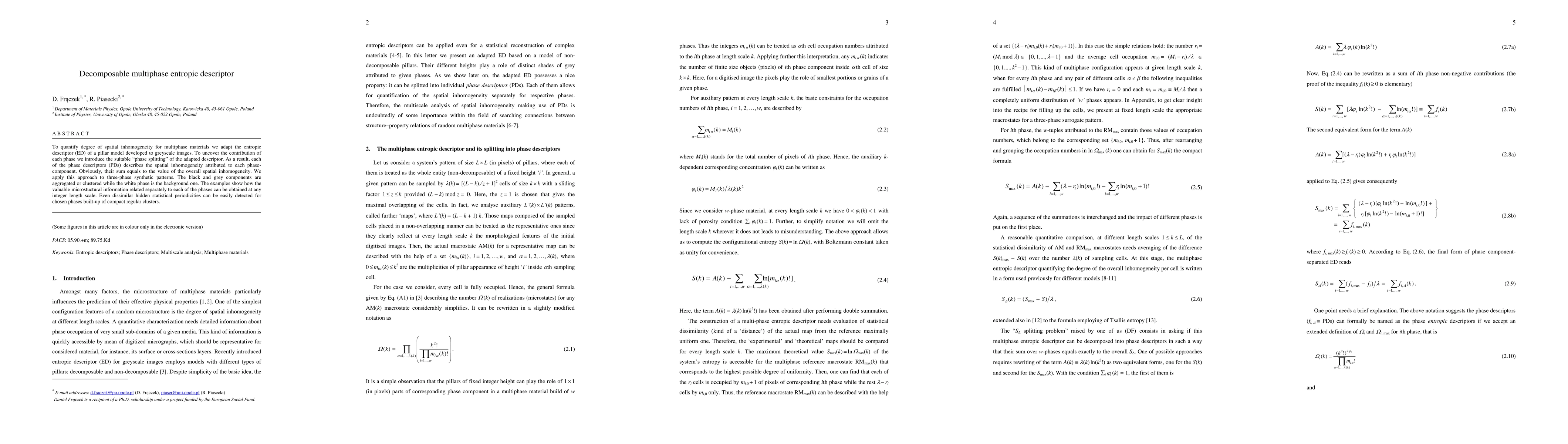 To quantify degree of spatial inhomogeneity for multiphase materials we adapt the entropic descriptor (ED) of a pillar model developed to greyscale images. To uncover the contribution of each phase we introduce the suitable 'phase splitting' of the adapted descriptor. As a result, each of the phase descriptors (PDs) describes the spatial inhomogeneity attributed to each phase-component. Obviously, their sum equals to the value of the overall spatial inhomogeneity. We apply this approach to three-phase synthetic patterns. The black and grey components are aggregated or clustered while the white phase is the background one. The examples show how the valuable microstuctural information related separately to each of the phases can be obtained at any integer length scale. Even dissimilar hidden statistical periodicities can be easily detected for chosen phases built-up of compact regular clusters.