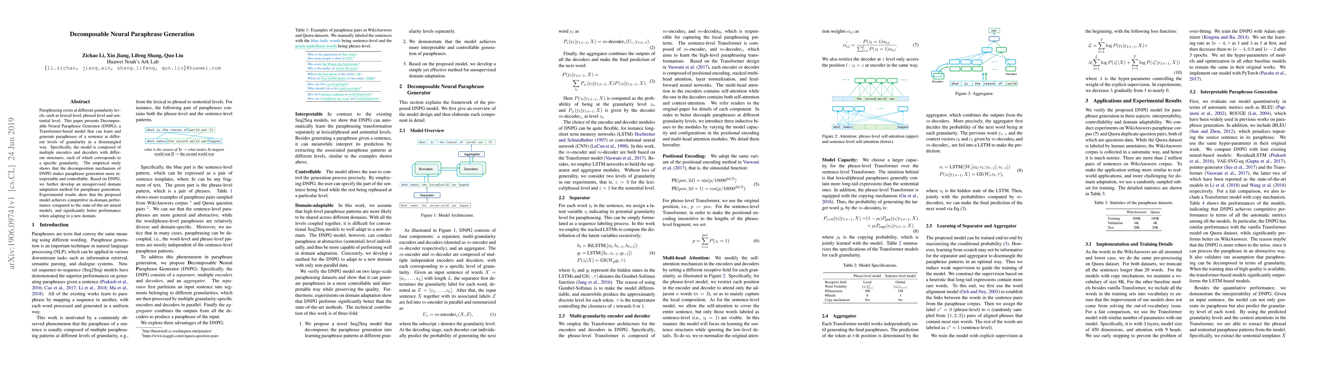 This paper introduces a Transformer-based model called Decomposable Neural Paraphrase Generator (DNPG) that generates paraphrases at different granularities in a disentangled manner. The model's decomposition mechanism enhances interpretability and controllability, and it also demonstrates competitive performance in domain adaptation.