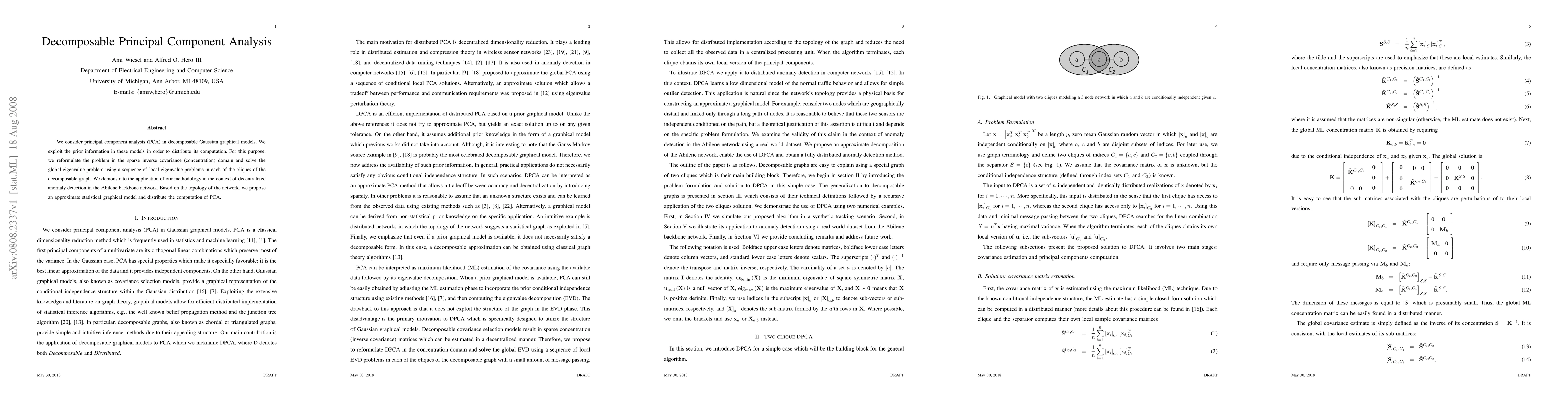 This paper proposes a distributed PCA method for decomposable Gaussian graphical models, reformulating the problem in the sparse inverse covariance domain and solving it locally in each clique. The approach is demonstrated for decentralized anomaly detection in the Abilene network.