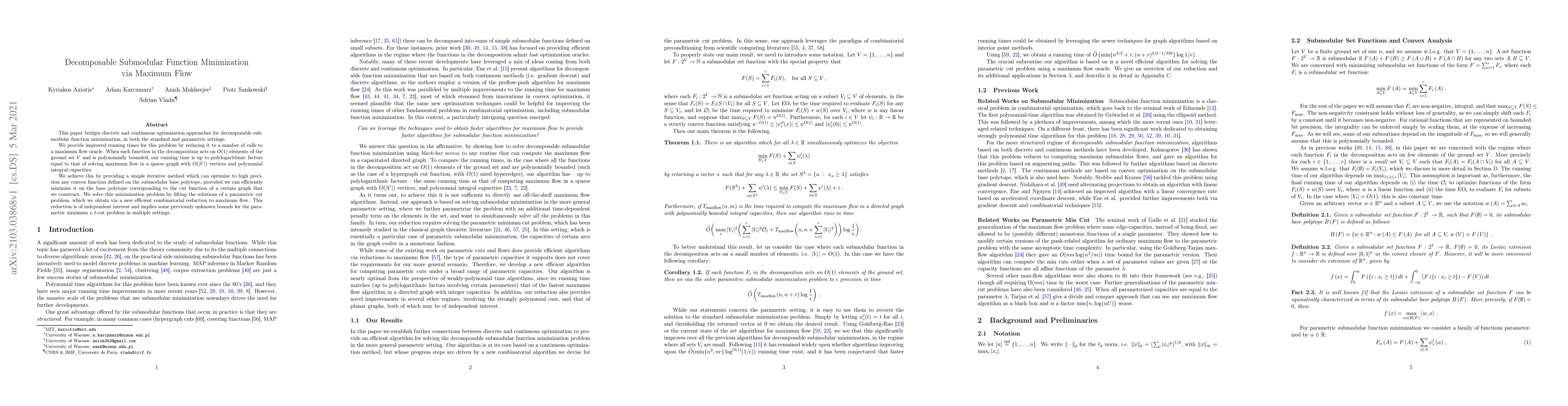 The paper bridges discrete and continuous optimization approaches for decomposable submodular function minimization, utilizing maximum flow oracles to improve running times in both standard and parametric settings.
