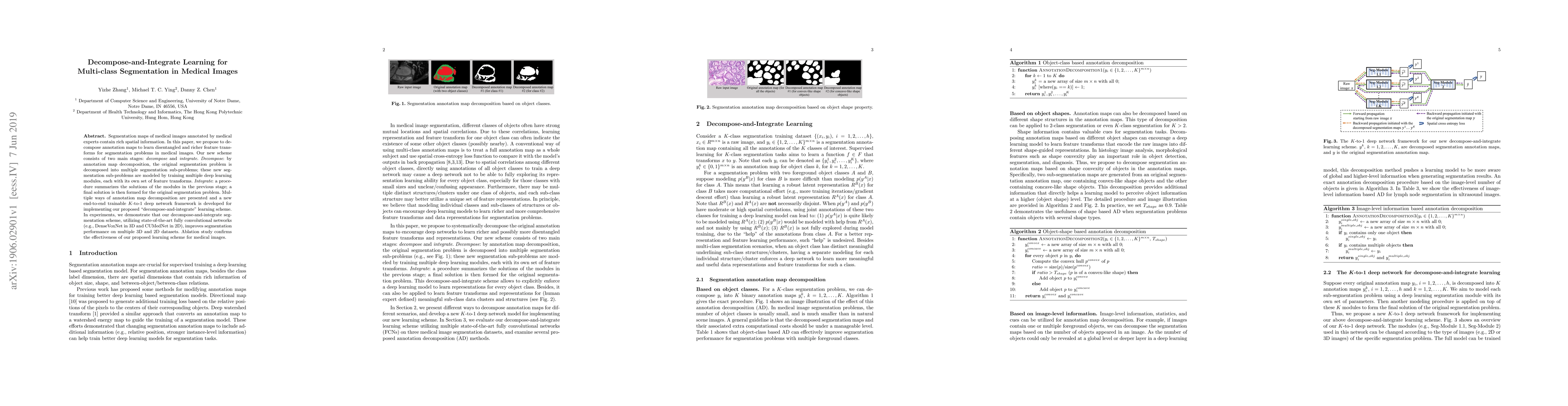 This paper proposes a "decompose-and-integrate" learning scheme to enhance multi-class segmentation in medical images by decomposing annotation maps into sub-problems and training multiple deep learning modules. The method integrates the solutions to form a final segmentation map, showing improved performance on various datasets.