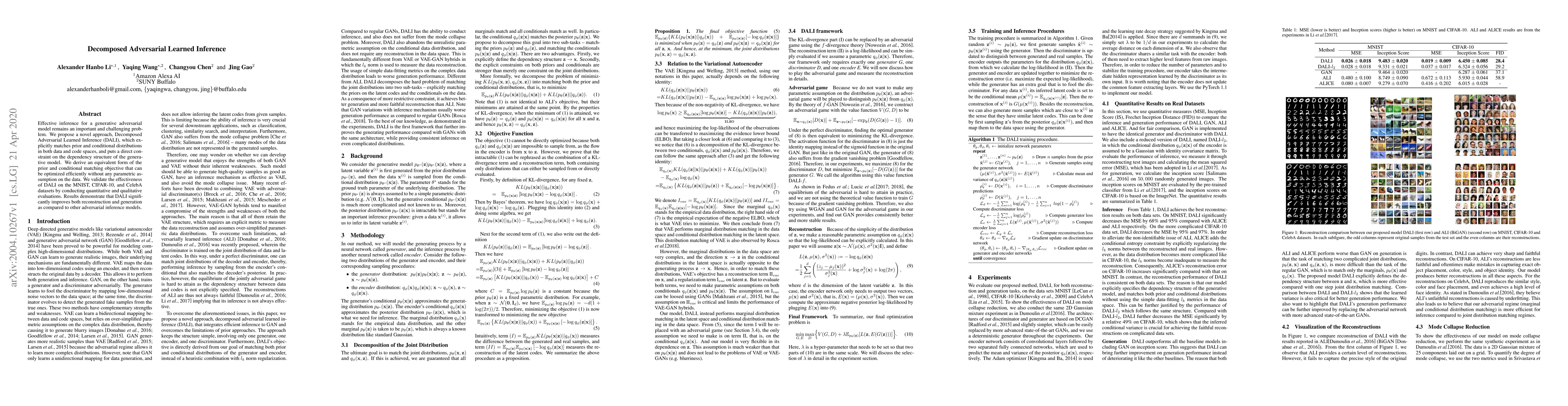 The paper introduces Decomposed Adversarial Learned Inference (DALI), a novel approach that enhances inference in generative adversarial models by matching prior and conditional distributions in both data and code spaces. DALI improves reconstruction and generation performance on MNIST, CIFAR-10, and CelebA datasets, outperforming other adversarial inference models.