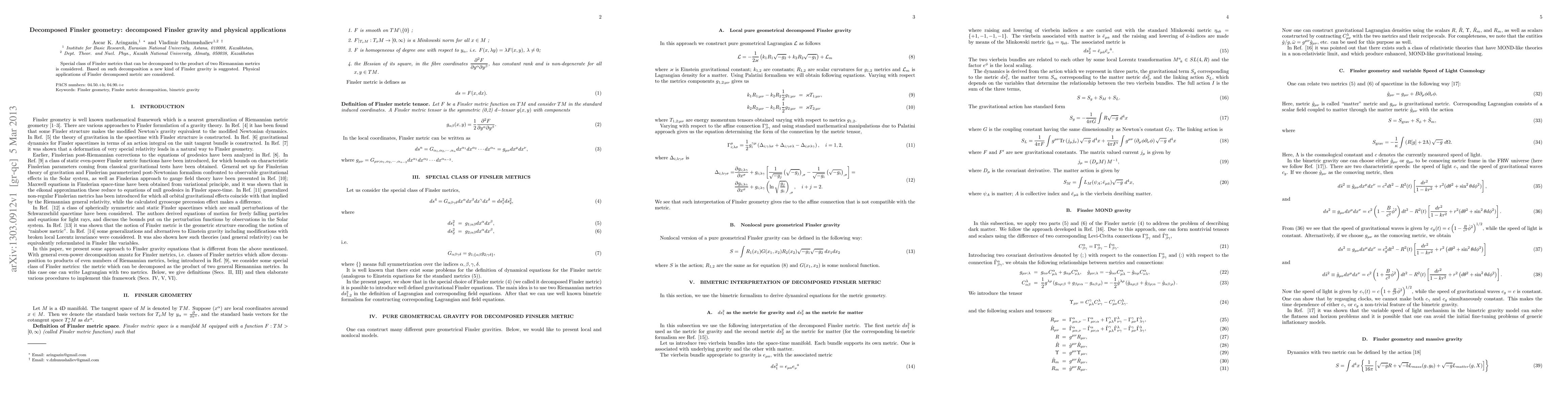 Special class of Finsler metrics that can be decomposed to the product of two Riemannian metrics is considered. Based on such decomposition a new kind of Finsler gravity is suggested. Physical applications of Finsler decomposed metric are considered.
